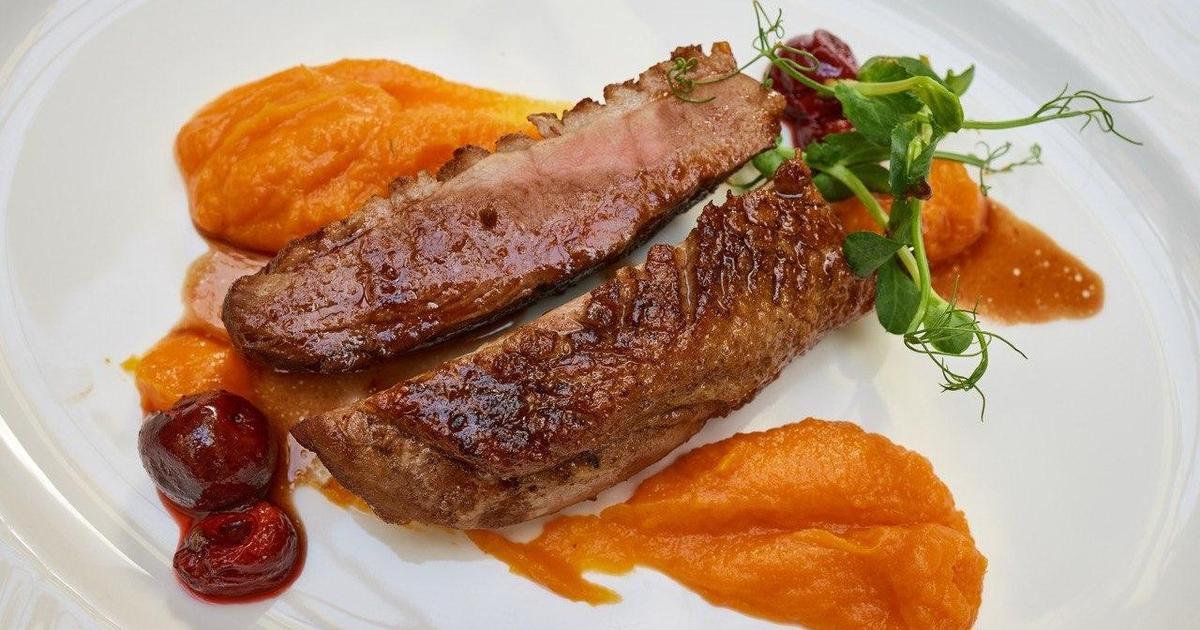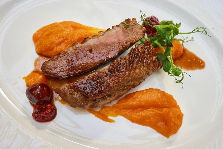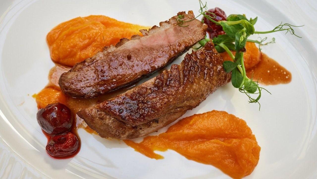 Утиная грудка с пюре из батата и вишневым соусом демиглас