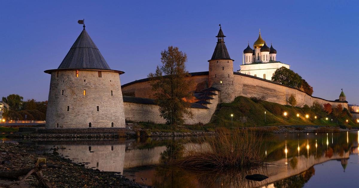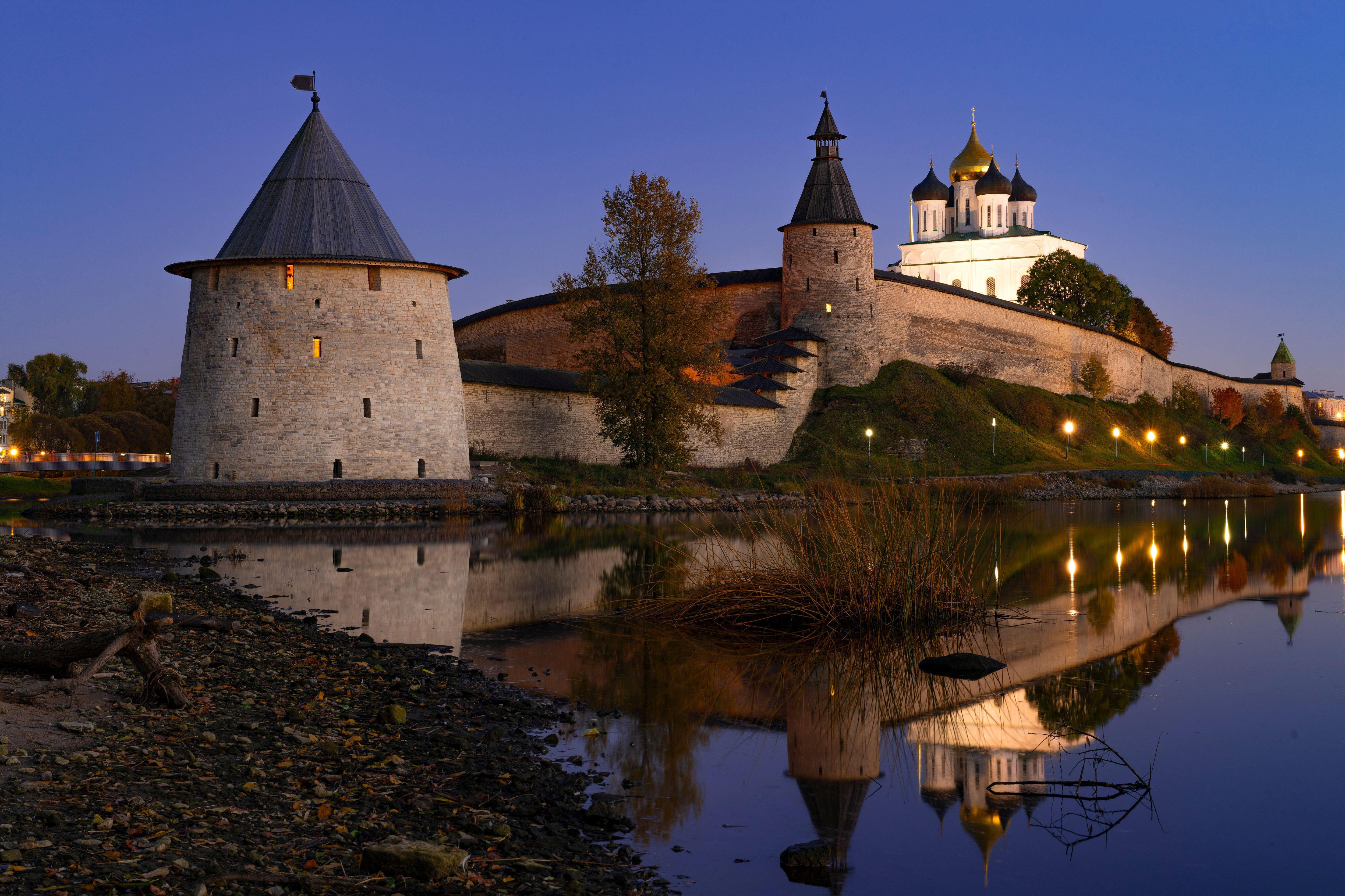 Псковский кремль, или Кром, выдержал двадцать шесть осад. Секрет кроется в его системе укреплений: двойных стенах, десятках башен и сложной оборонной геометрии. В центре возвышается Троицкий собор — сердце древнего города. С башен открывается живописный вид на реку Великая, а вечером белые стены окрашиваются в золотисто-розовые тона.