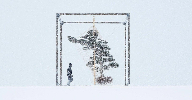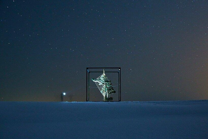 Лед здесь — способ остановить время и показать медленное увядание. В другой работе он подвесил крупную сосну на металлической конструкции над снежным полем, создав эффект парящего в воздухе дерева с обнаженными корнями.