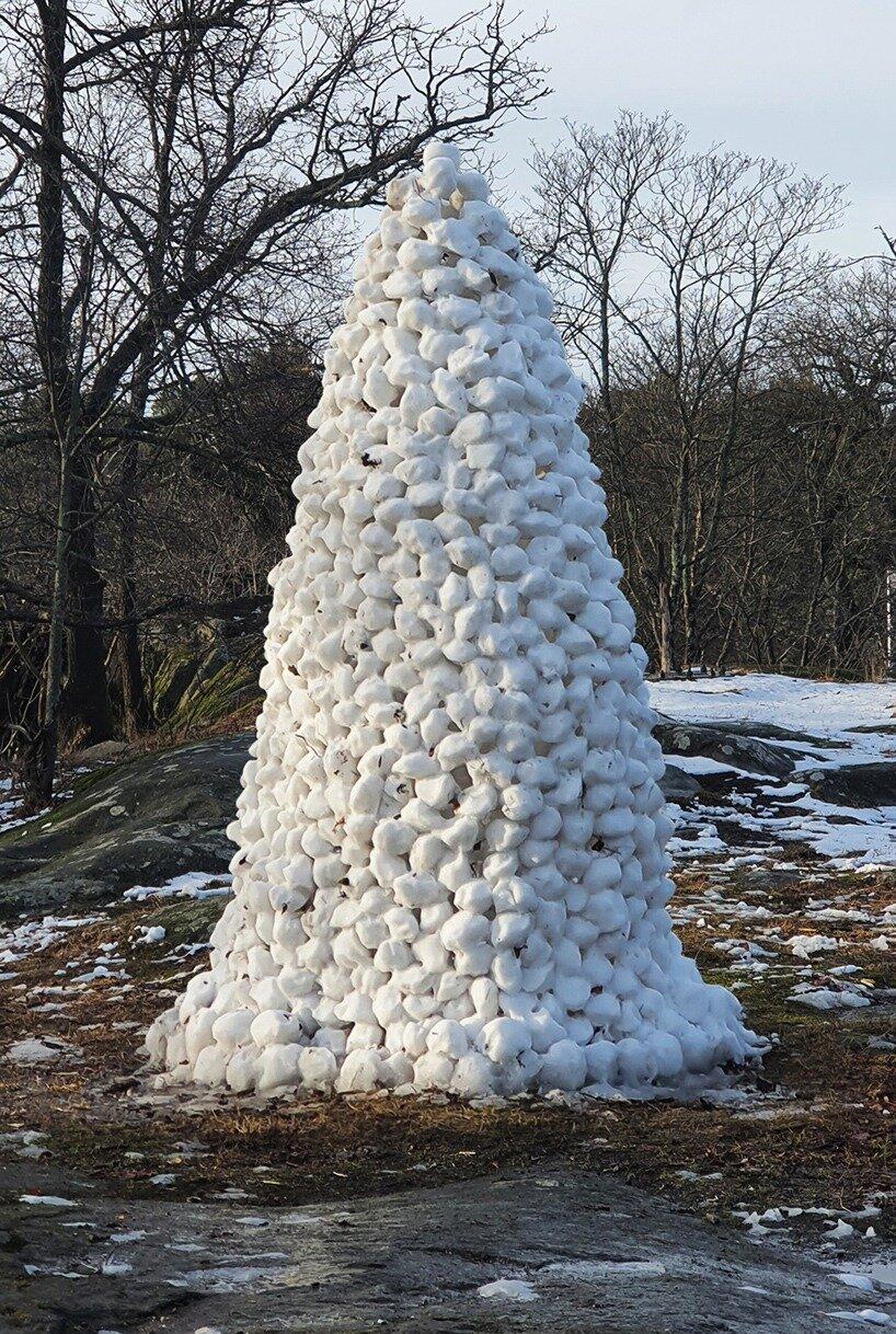 Второй, более камерный проект — «Хижина из снежков» от бюро Ulf Mejergren Architects в Стокгольме. Это была первая работа серии, где они исследуют простые формы из одного природного материала. Хижину построили вручную из 4000 снежков, сложенных в небольшое замкнутое сооружение. Архитекторы отмечают, что лучшие условия для строительства — температура около 2–3°C, когда снег достаточно липкий, но не тает.