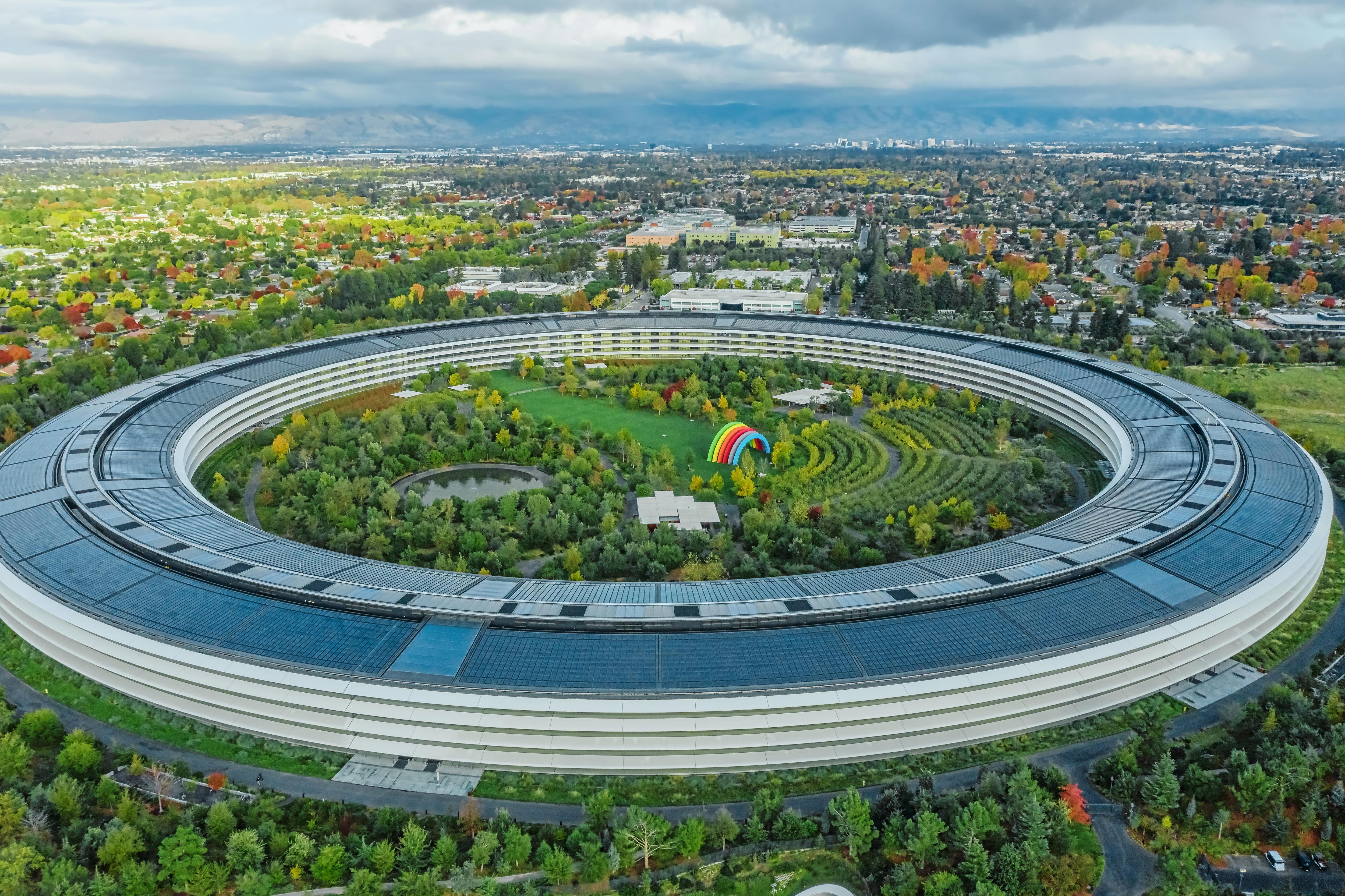 Штаб-квартиру Apple в Купертино часто сравнивают с космическим кораблем из-за круглого плана и футуристической эстетики. Территория кампуса включает фитнес-центр, обширные парковые зоны с засухоустойчивыми растениями и сад плодовых деревьев. Большую часть потребностей здания в электроэнергии обеспечивают огромные солнечные батареи мощностью 17 мегаватт на крыше, что движет компанию к полному переходу на возобновляемую энергию.