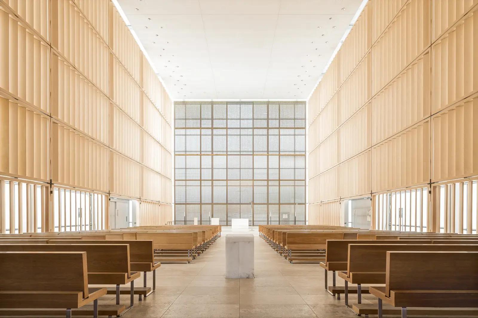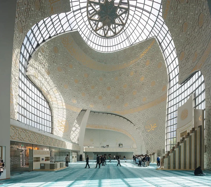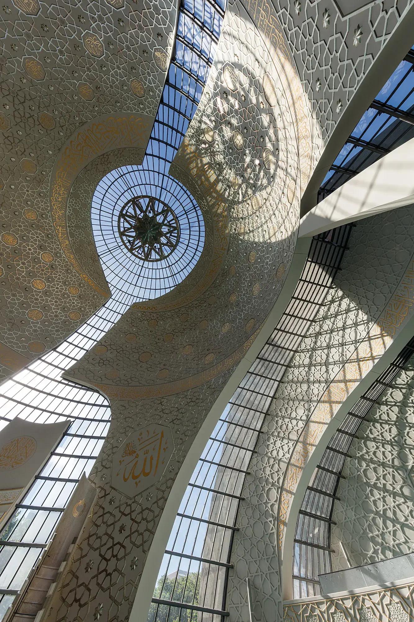 Молитвенный зал, окруженный библиотекой и административными помещениями, раскрывается, словно цветок. Шесть оболочек изгибаются «над вертикальными стенами, образуя защитную крышу над священным пространством», — объясняет кельнский архитектор Поль Бем. Перегородки конструкции выполнены из прозрачного стекла, благодаря чему создается связь между внутренним и внешним пространством.