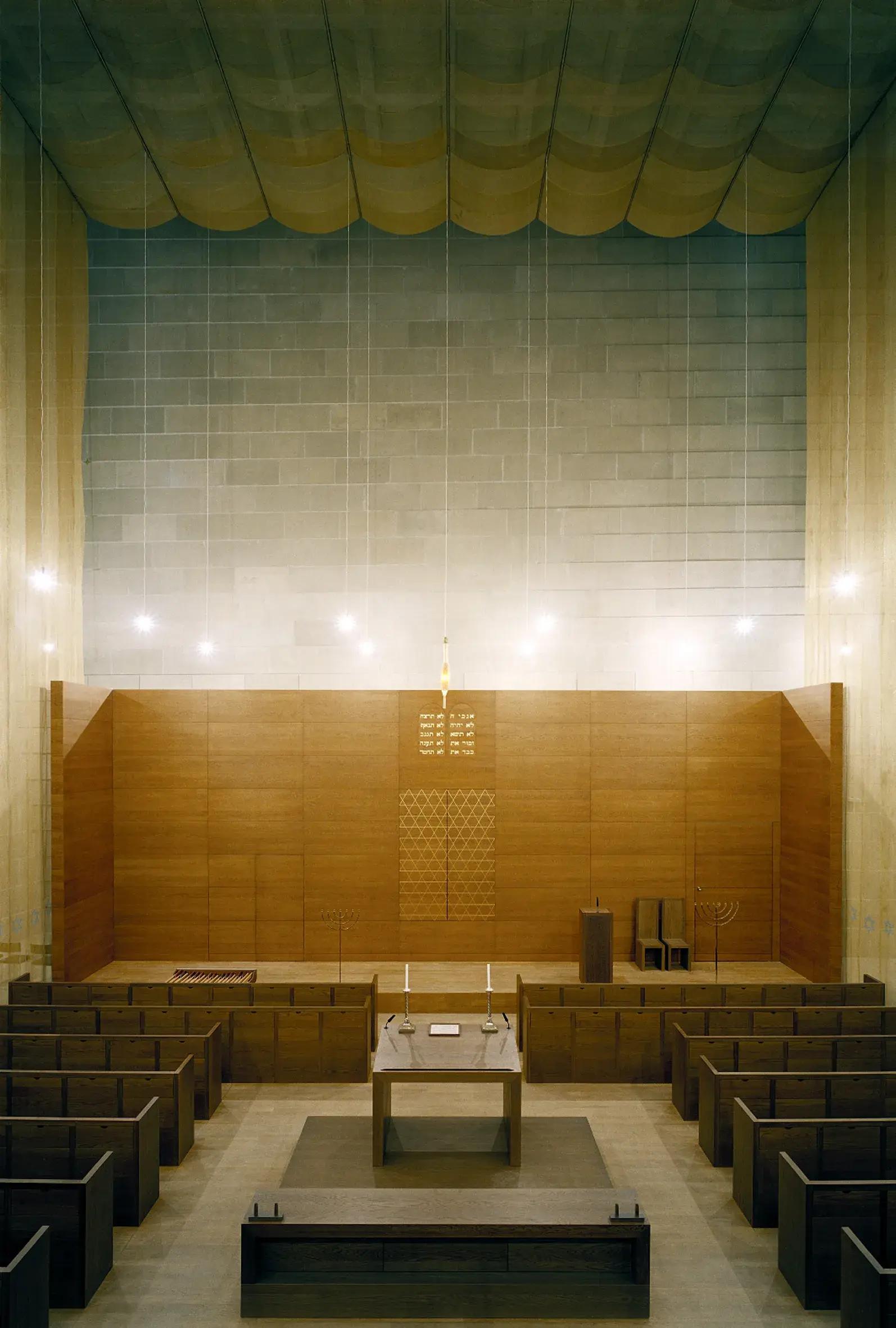 Внутри синагога совершенно иная. Центральное пространство для молитвы свободно располагается внутри массивной конструкции и как бы окутано металлической тканью, меняющей цвет и отражающей свет.