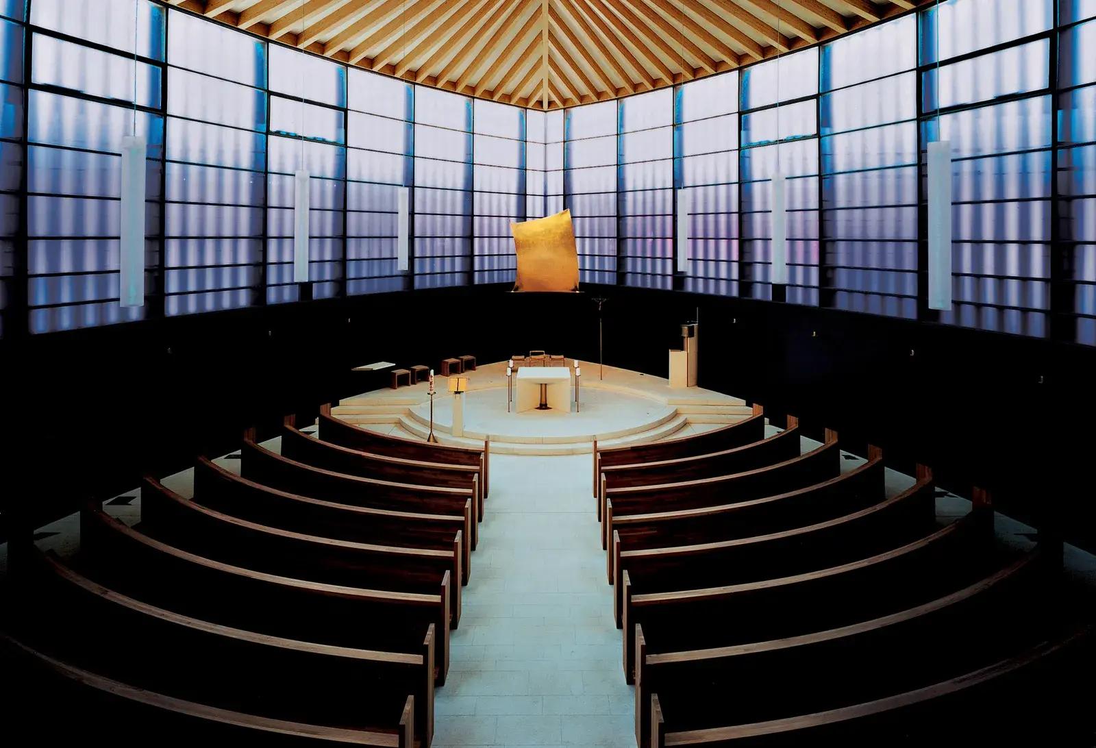 Эллиптическая стена растет вверх, вращаясь и многократно перекрываясь, перспективы постоянно искажаются и меняются. Посетители оказываются в эпицентре разрушительного урагана, в точке его затишья. Церковь, холодно рассчитанная форма, созданная на компьютере, становится защитным пространством: над ней свет иногда сверкает настолько интенсивно, что переход между стеной и потолком размывается.