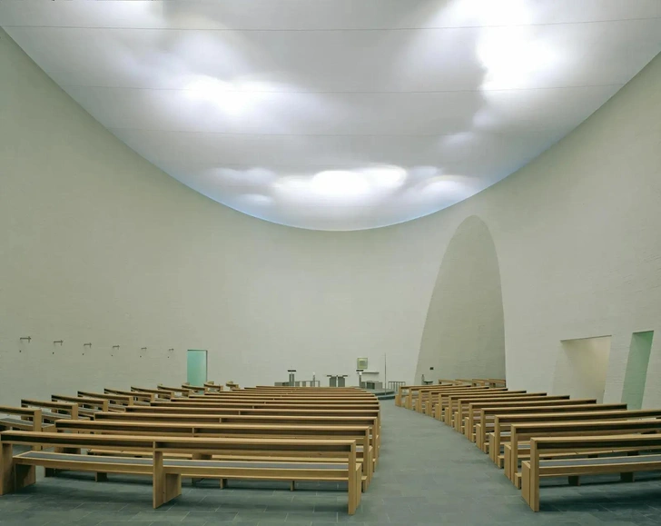Как только двойные двери распахиваются, вестибюль вспыхивает золотистым светом сквозь массивную кирпичную кладку. Яркий свет окутывает посетителей приходского центра Святого Франциска в Регенсбург-Бургвайнтинге. Там, где обычно располагаются балки и тяжелые кровельные конструкции, архитектурное бюро Königs Architekten из Кельна натянуло мембрану, своего рода киноэкран. Он наполняет интерьер церкви облачными пейзажами и небесно-голубым цветом. Божественное кино.