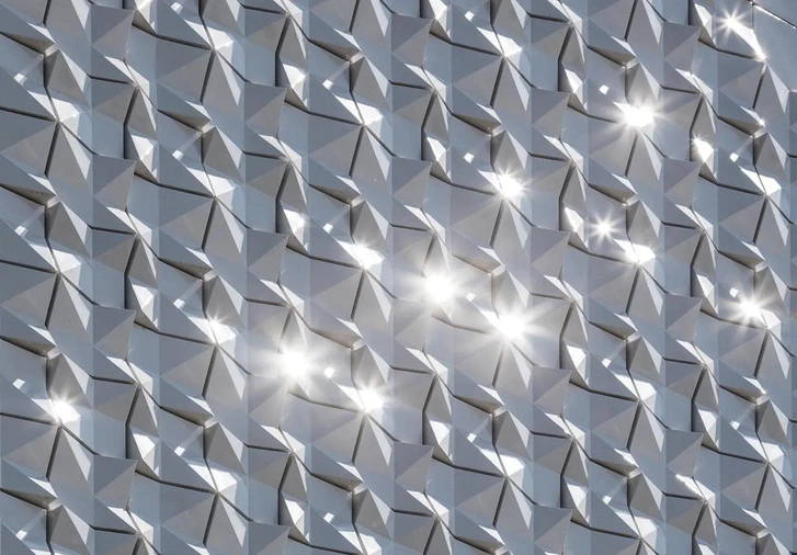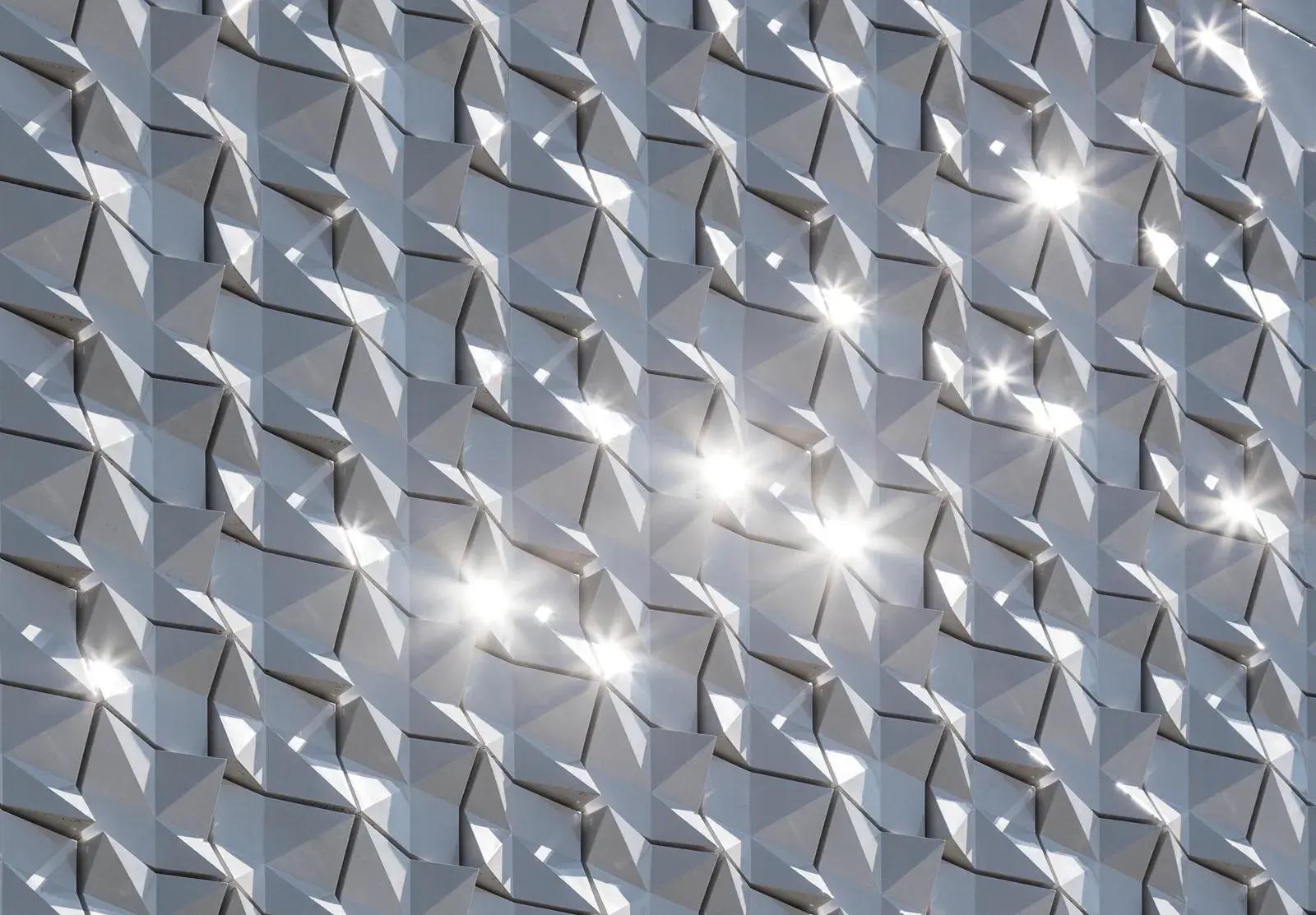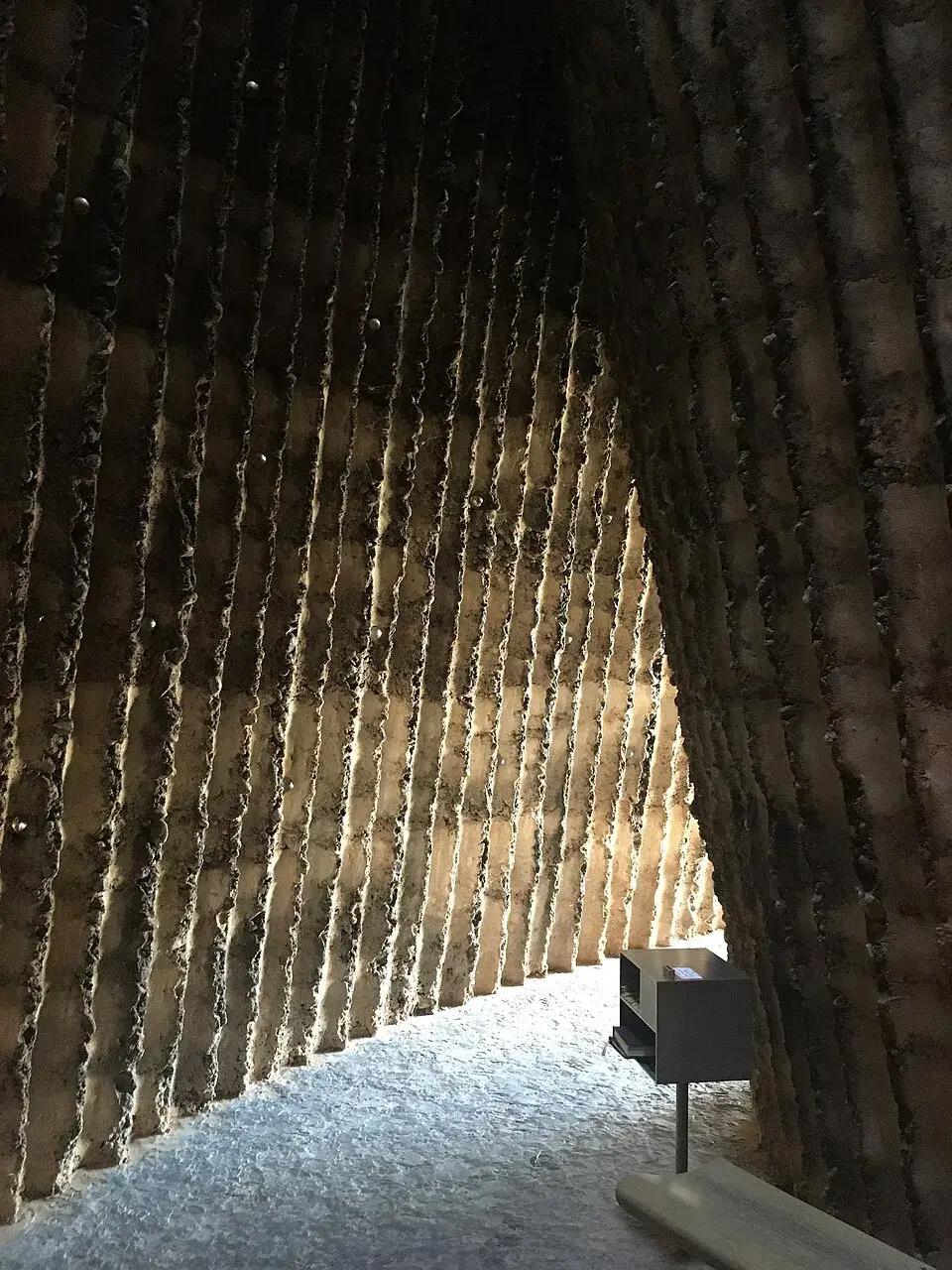 Наклон крыши над алтарем делает здание немного похожим на палатку. Фасад и крышу покрывают 15 000 керамических плиток, благодаря чему здание напоминает свитер или мятую ткань.