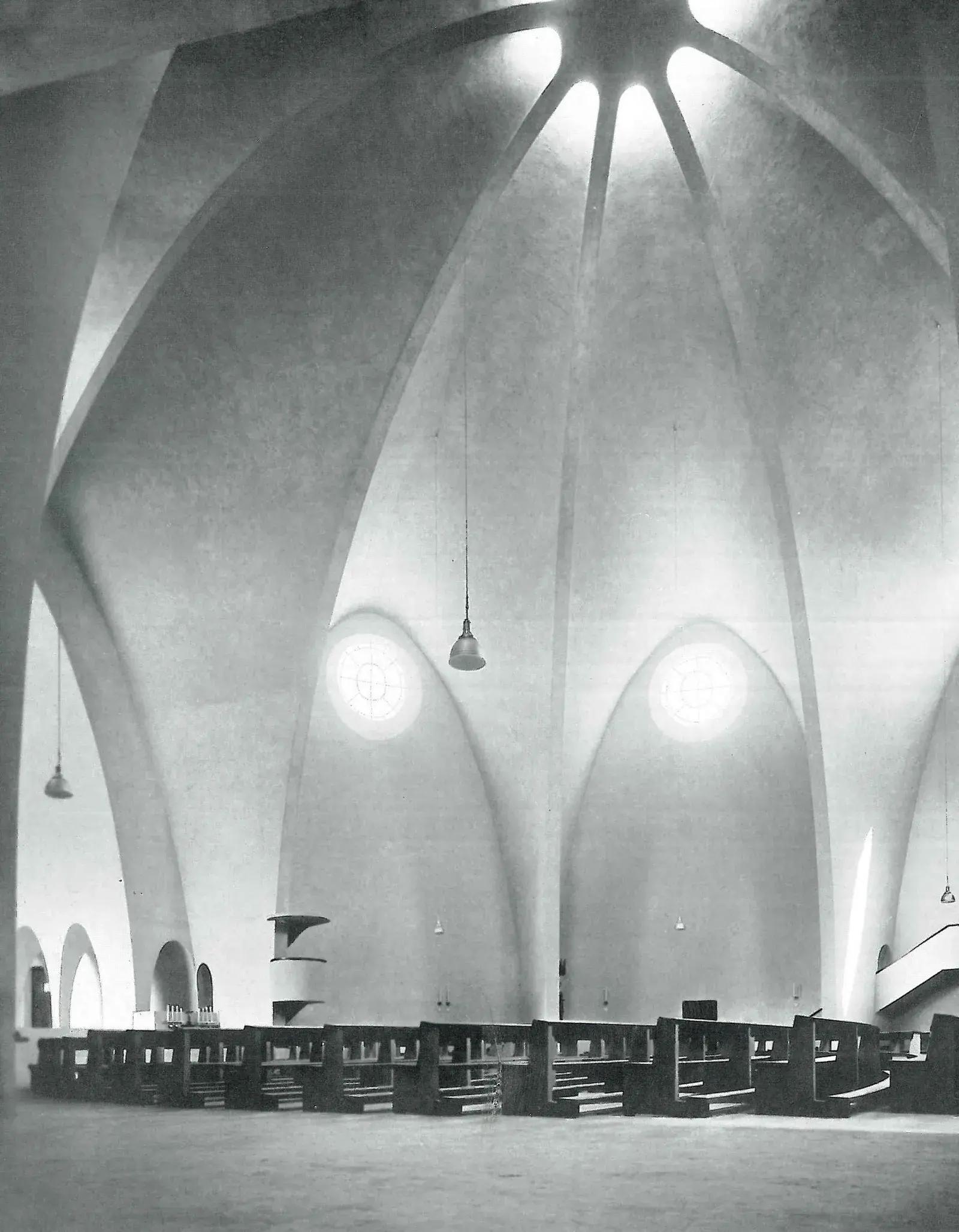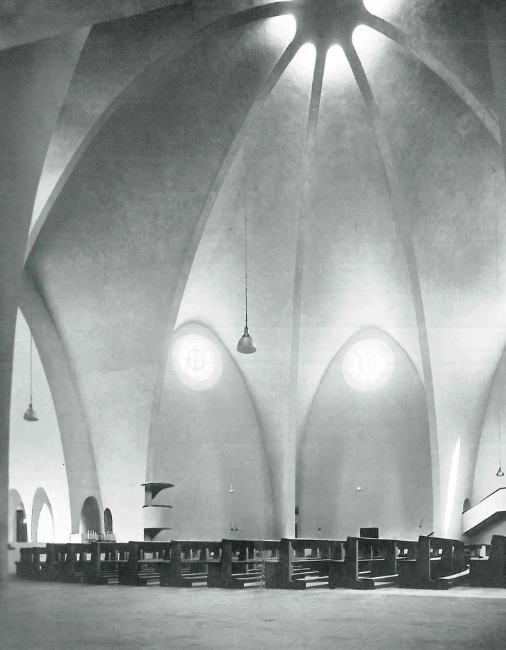 Эта, казалось бы, танцующая конструкция (построенная между 1930 и 1932 годами) играет с формами параболы, которая охватывает все восемь фасадов, подобно арке, соединяющей небо и землю, и одновременно демонстрирующей современность — статичную конструкцию из железобетона. Вершина восьми арок действительно поддерживает своего рода звездный купол.