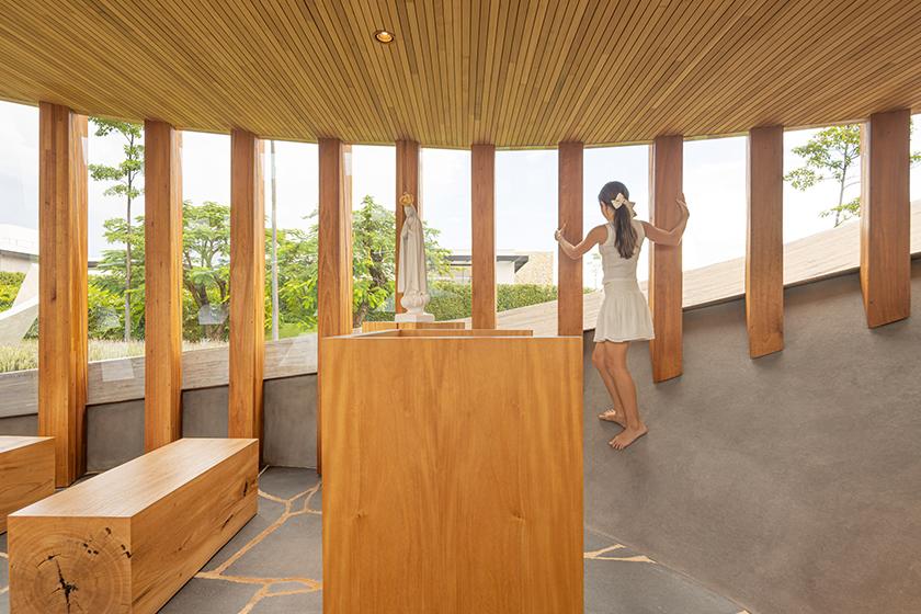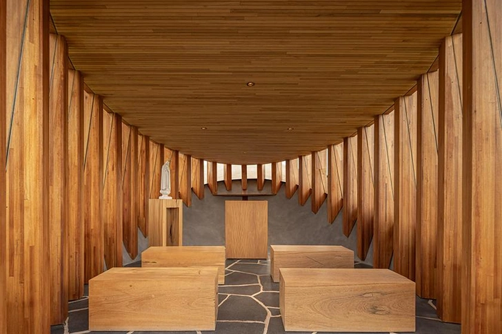 Внутри вся мебель — скамьи, амвон, постамент для икон — выполнена из цельного дерева с простыми, скульптурными формами, где главным украшением выступает сама материя.