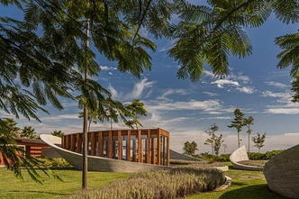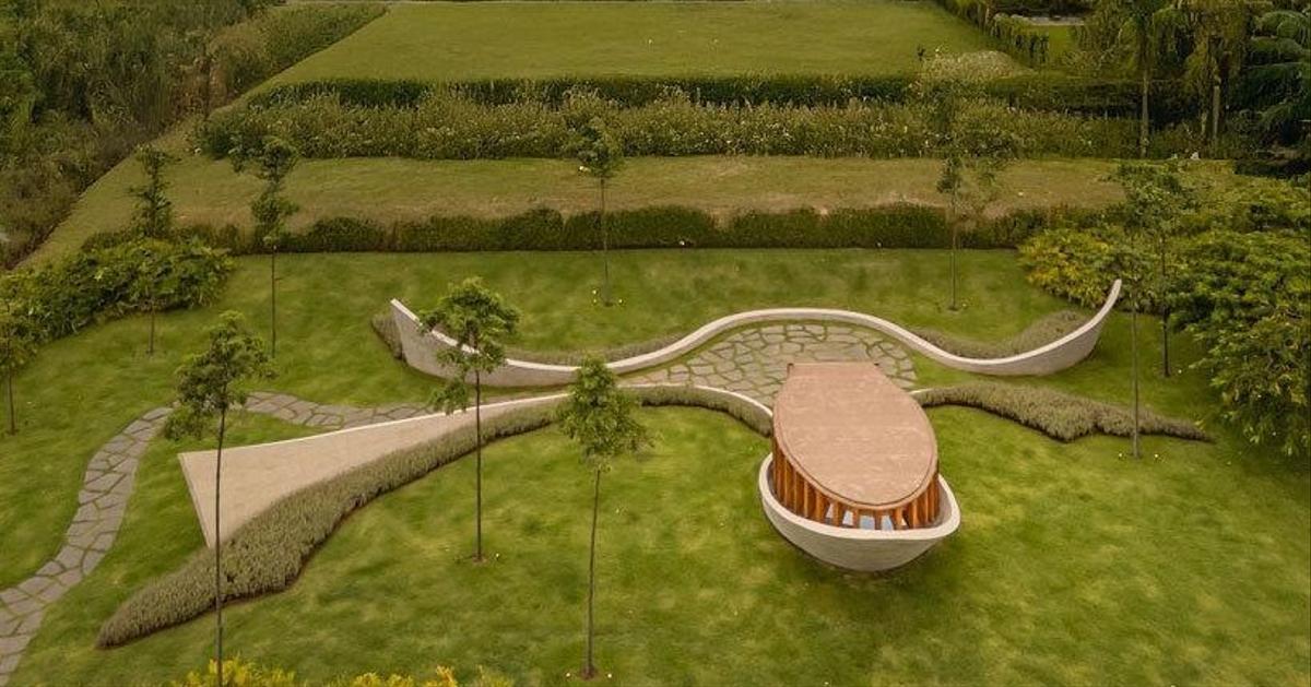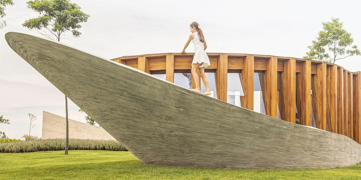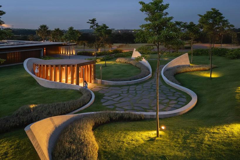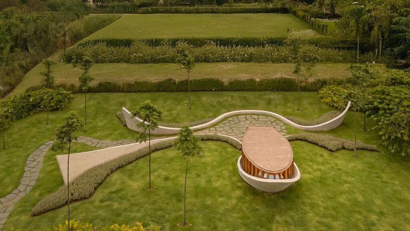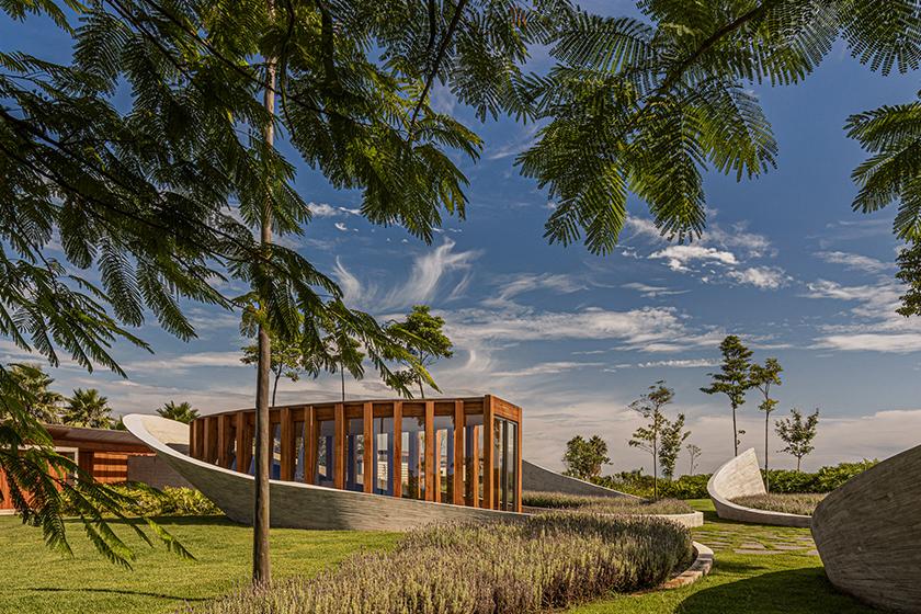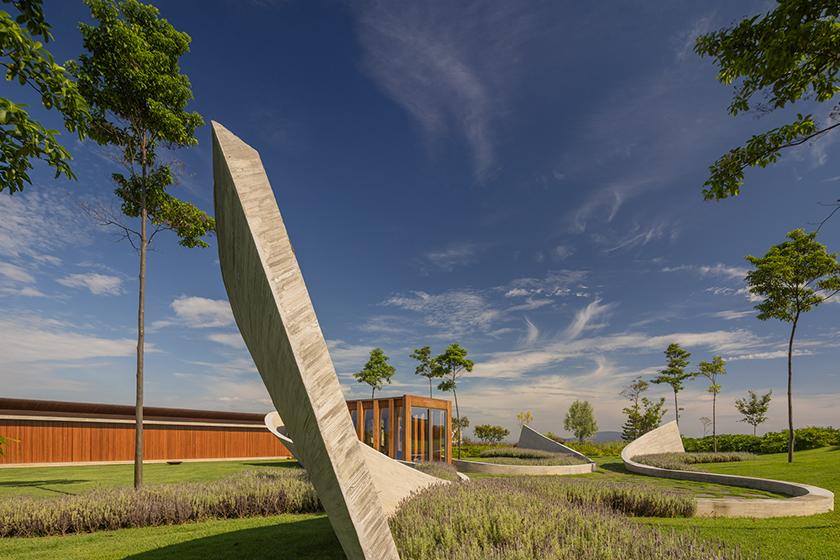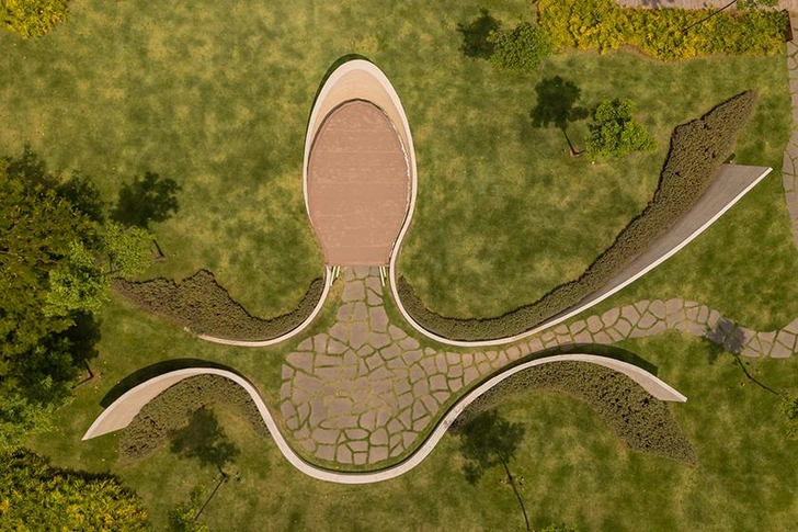 Основа архитектурного решения — две монолитные бетонные стены сложной криволинейной формы. Они выполняют сразу несколько функций: служат несущими конструкциями, ограждением и главным элементом, формирующим восприятие. Пространство между этими стенами образует входную зону и постепенно подводит человека к цели. Этот продуманный путь символически отделяет повседневность от момента сосредоточения.