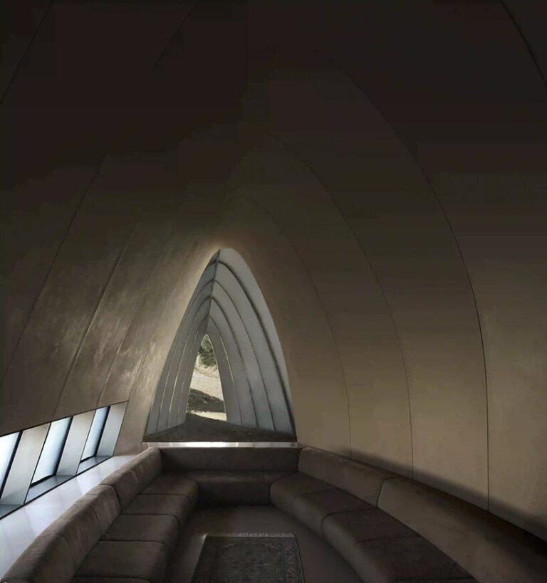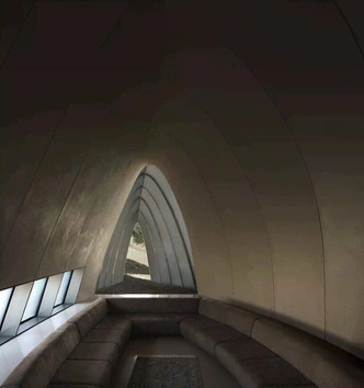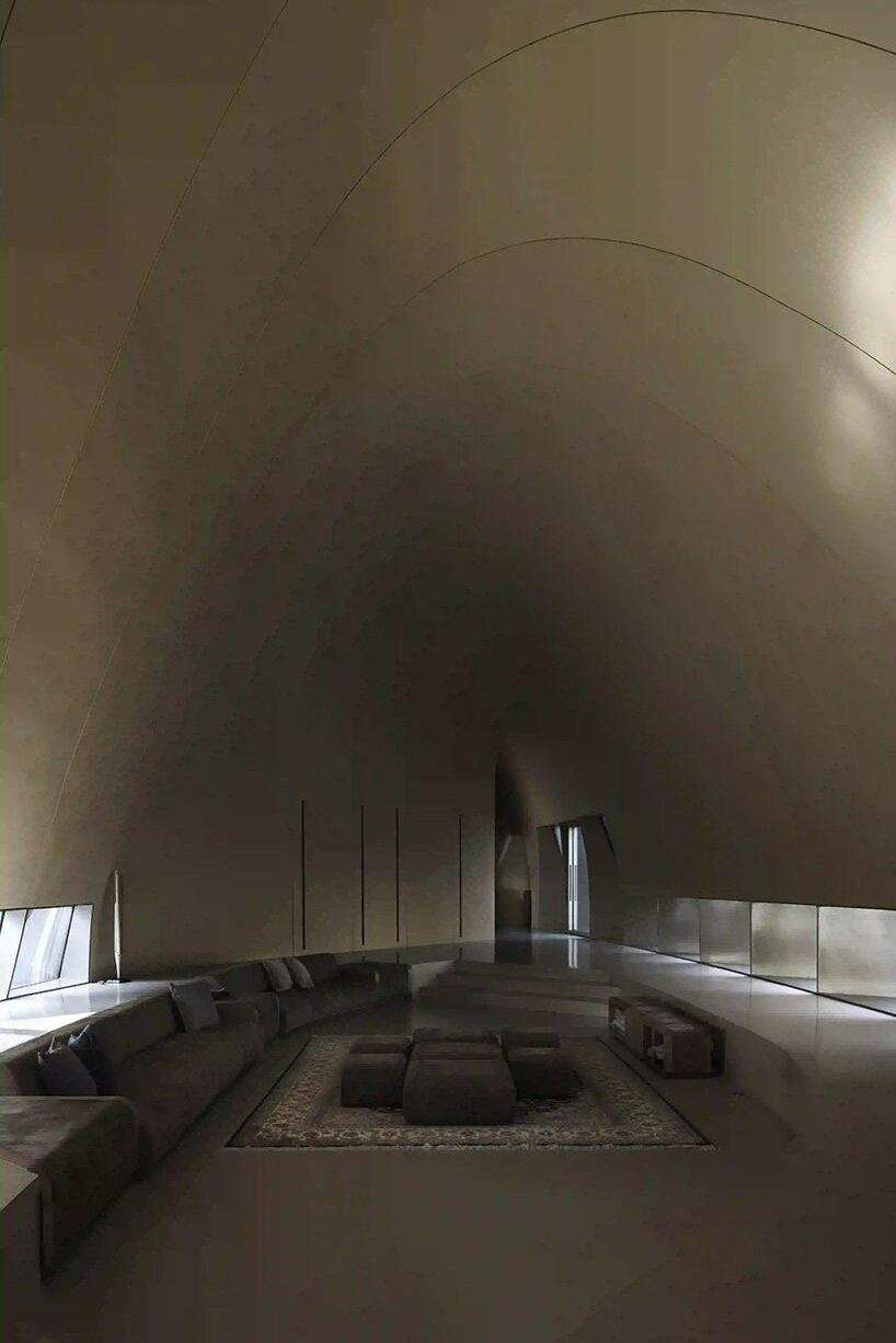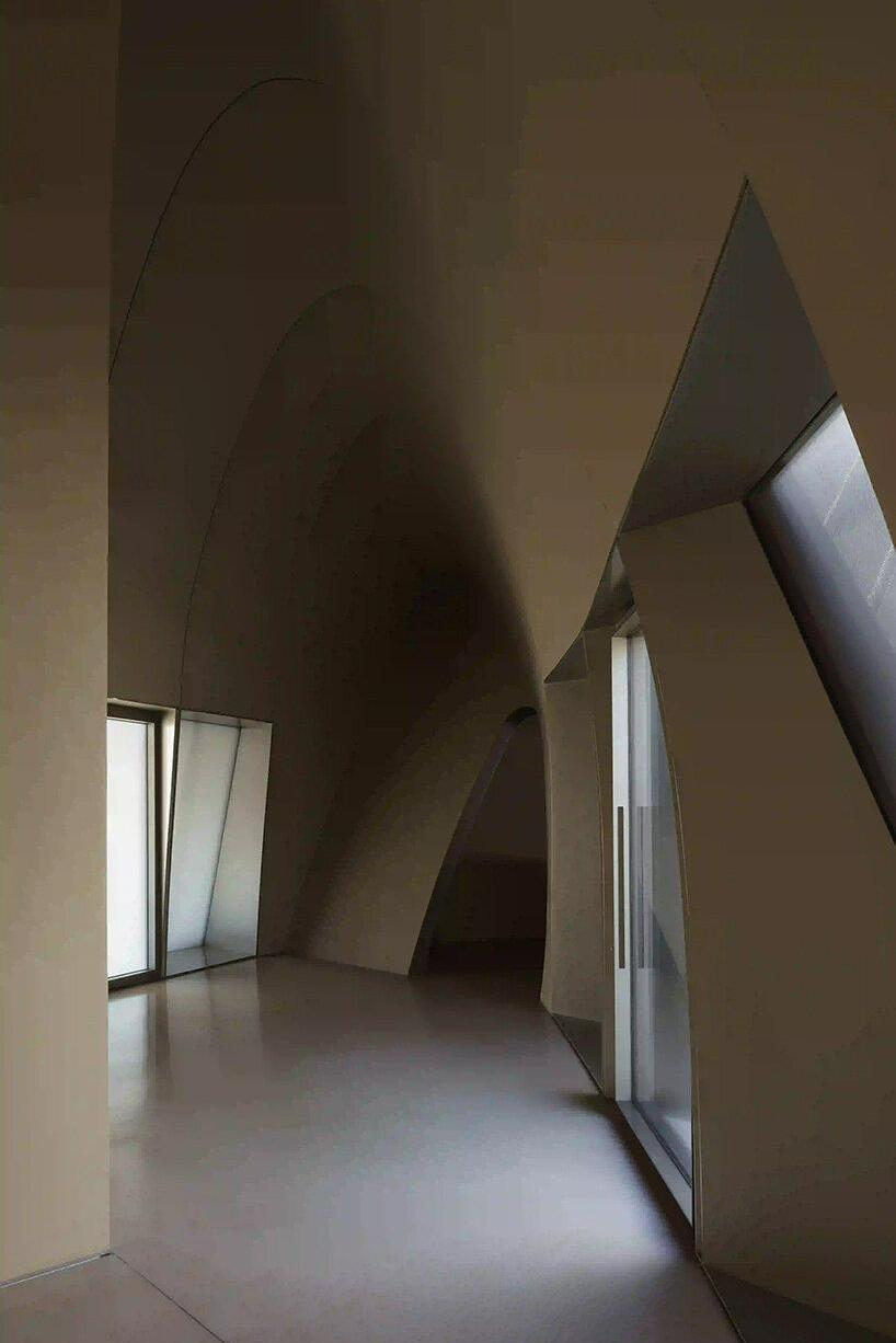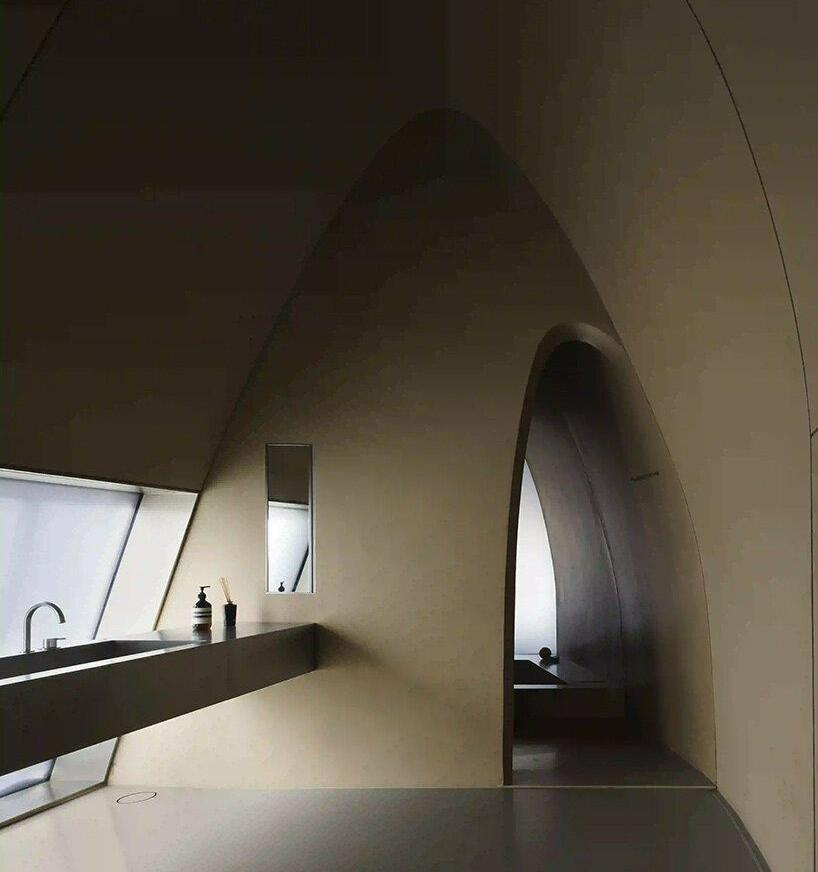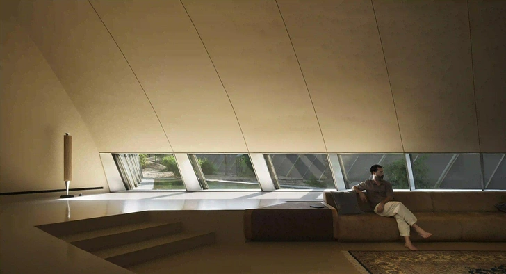 Пространства выстроены через пересечения арочных конструкций, наклонных плоскостей и вертикальных изгибов. Такой подход создает сложные перспективы и неожиданные визуальные связи между комнатами, садом и другими зонами дома. Высокие изогнутые потолки формируют меняющееся восприятие интерьеров, а верхний свет из узких оконных проемов мягко подсвечивает фактуру бетона.