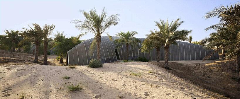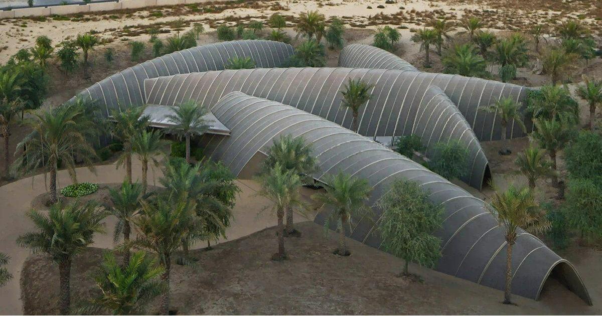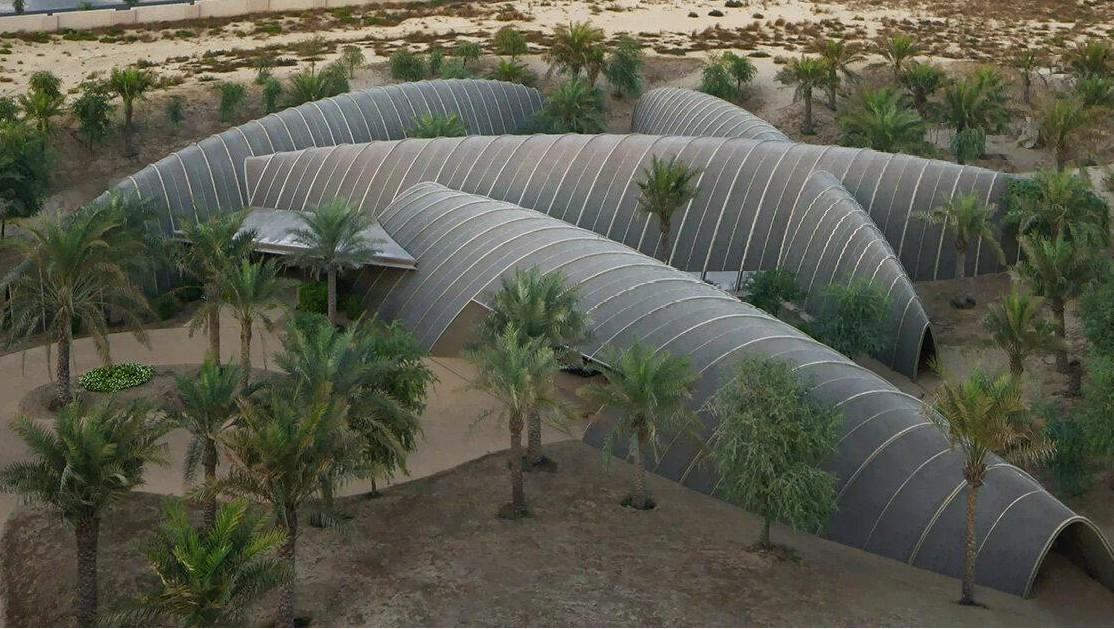 Ключевая задача проекта — создать в зданиях автономный микроклимат. Для этого в центре организован углубленный сад-водоем, выступающий климатическим и композиционным ядром. Эта влажная зона с растительностью работает как естественный охладитель и источник тени, создавая резкий контраст с внешней средой.