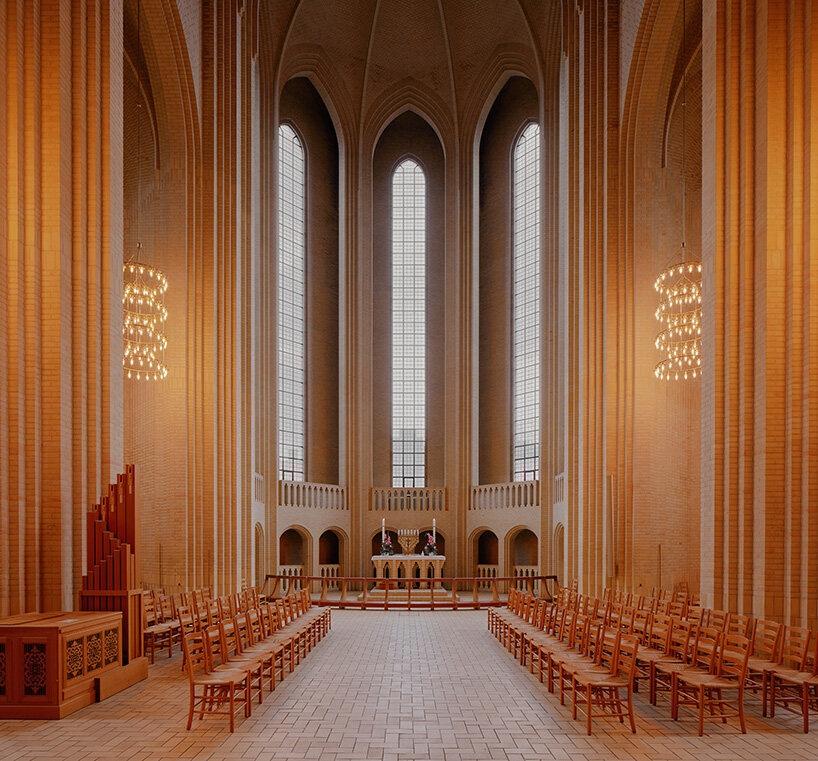 Расположенная в районе Биспебьерг в Копенгагене церковь Грундтвига — одно из самых уникальных произведений церковной архитектуры XX века. Спроектированная Петером Вильгельмом Йенсеном-Клинтом и завершенная в 1940 году, церковь воплощает вертикальные амбиции готической архитектуры на языке экспрессионизма. Здание полностью построено из желтого датского кирпича.