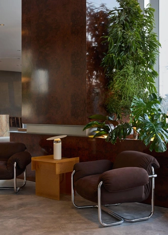 Пространство поделили на зоны. Большой общий стол и мягкие кресла подходят для работы. Вокруг острова с баром поставили столики — для тех, кто пришел пообщаться. В отдельной лаунж-зоне — диваны, кресла, на стенах работы художников, стоит проигрыватель для пластинок. Здесь можно задержаться надолго.
