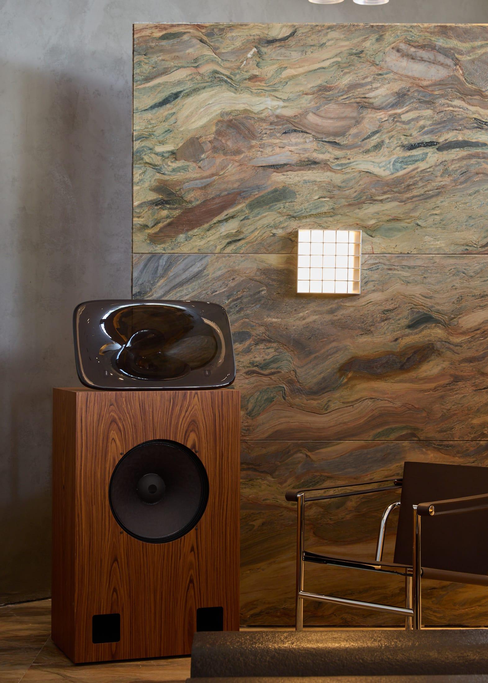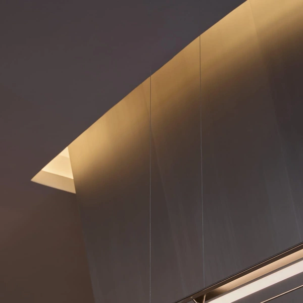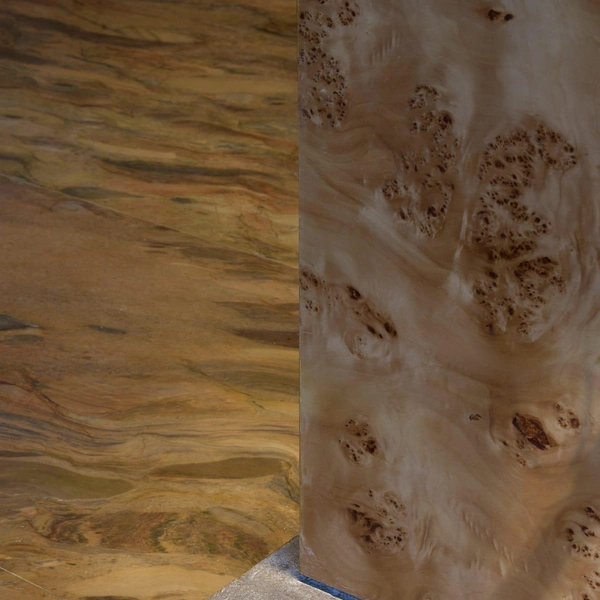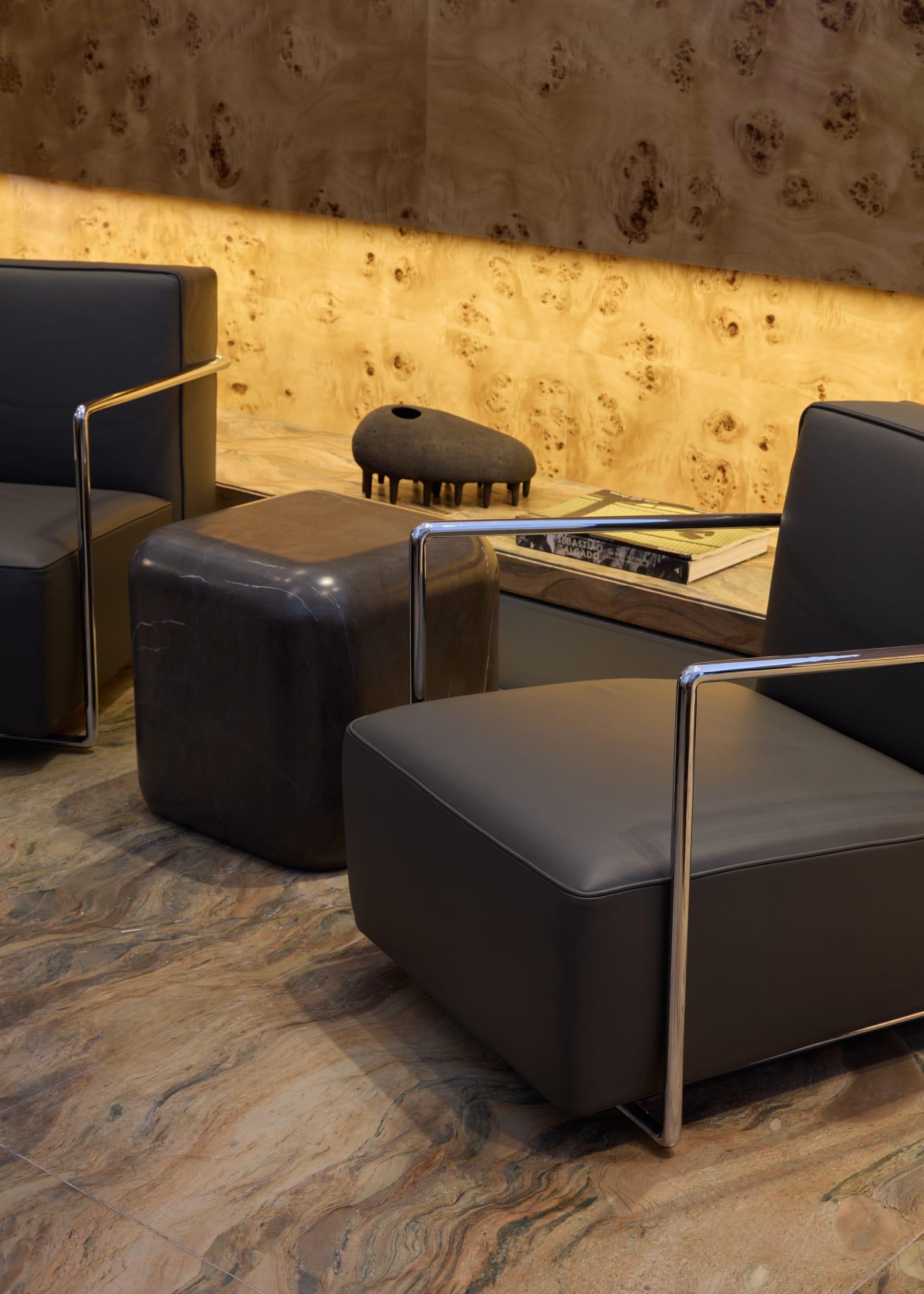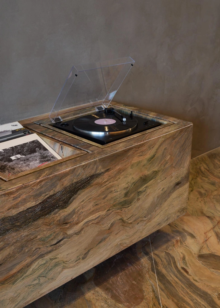Материалы подобраны с особым вниманием к текстурам. Сталь ловит и отражает свет, мрамор с яркими прожилками задает визуальные акценты, шпон капа с узловатой текстурой добавляет теплоты. Дерево, камень, стекло и сталь вместе создают слоистую среду — сложную, но уютную.