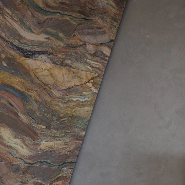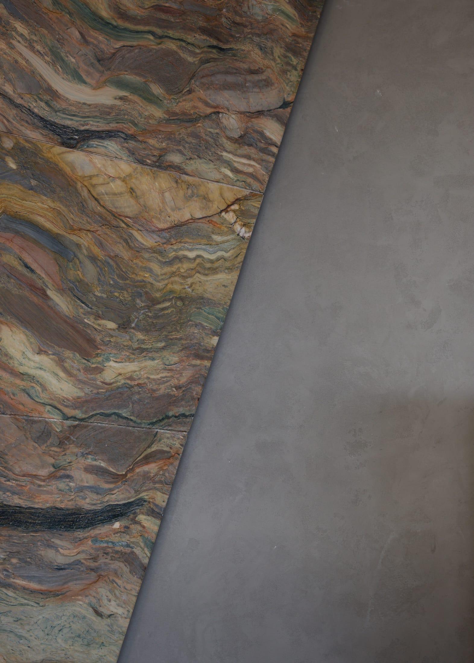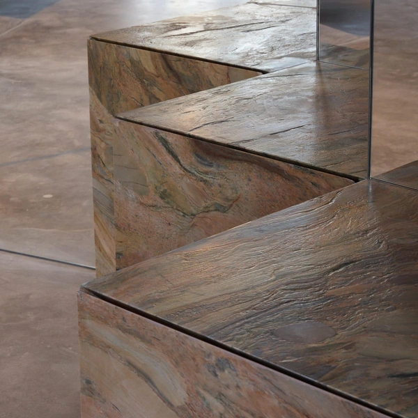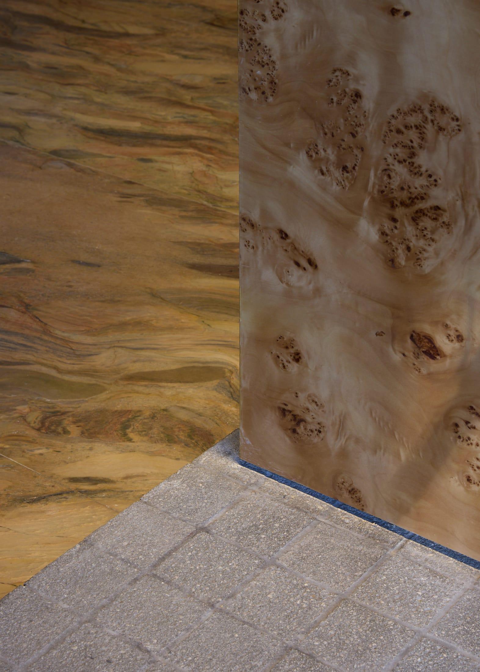 Материалы подобраны с особым вниманием к текстурам. Сталь ловит и отражает свет, мрамор с яркими прожилками задает визуальные акценты, шпон капа с узловатой текстурой добавляет теплоты. Дерево, камень, стекло и сталь вместе создают слоистую среду — сложную, но уютную.