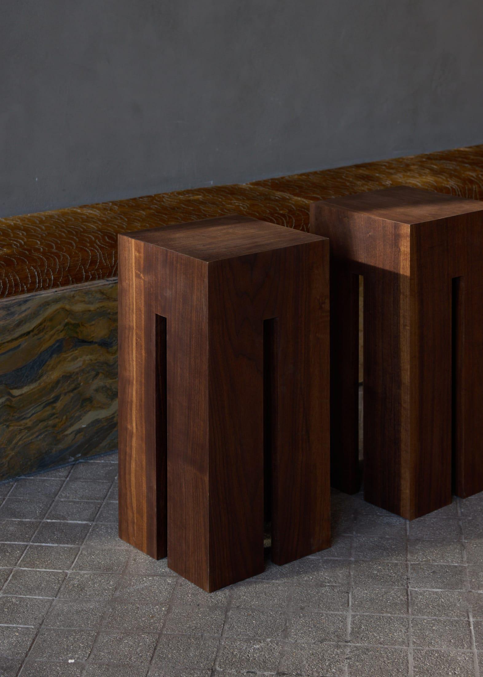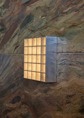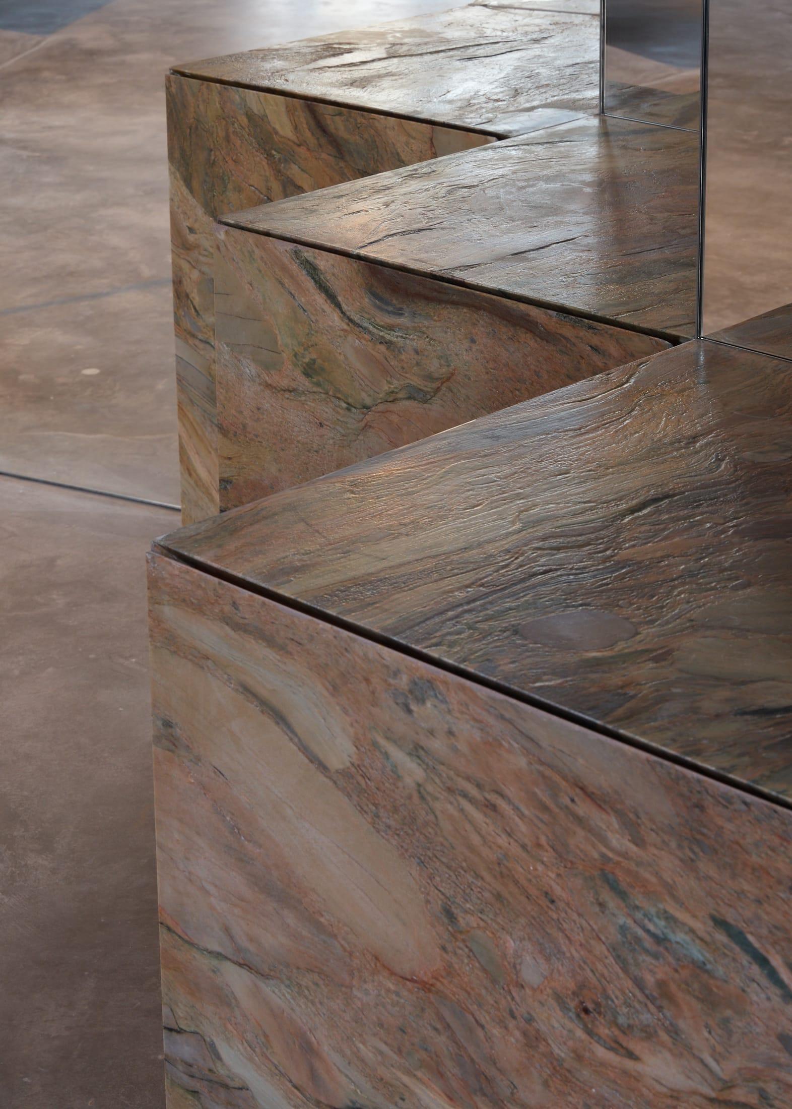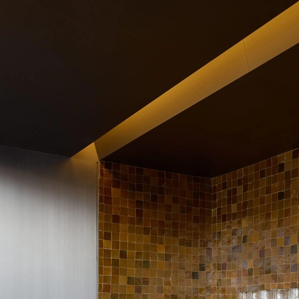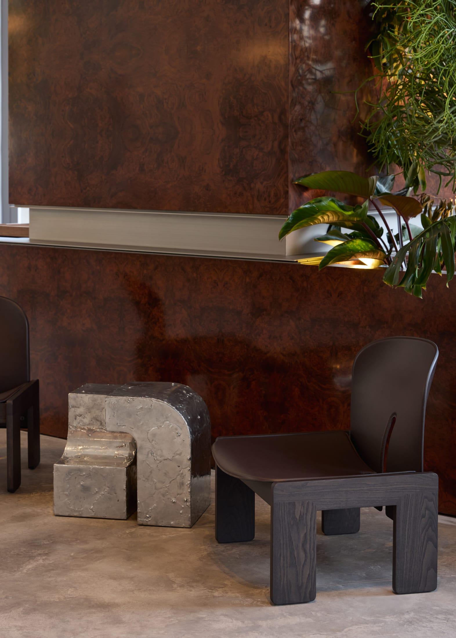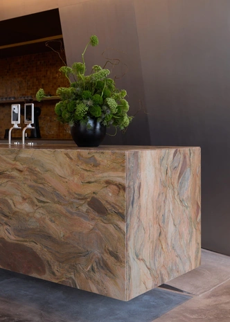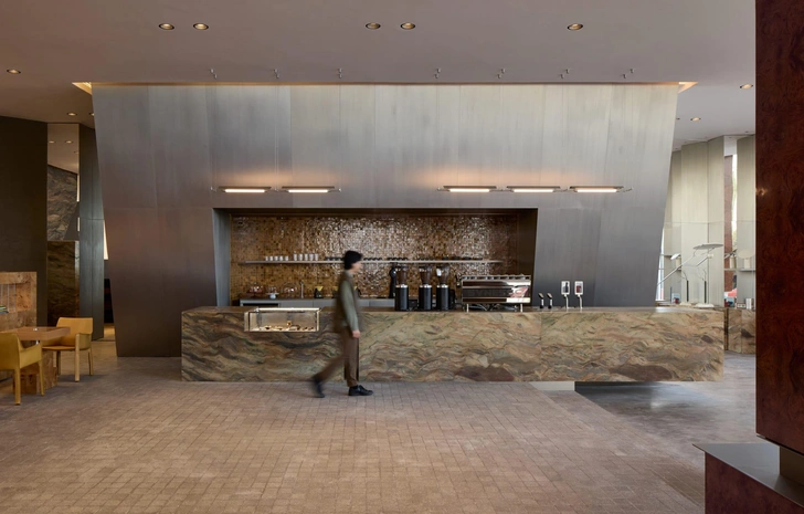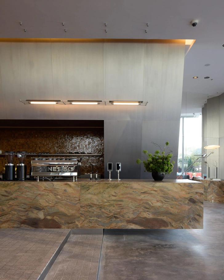 В центре зала — каменный остров с консольной столешницей. За ним расположена стена из стали, установленная под наклоном, плитка на которой вносит в строгую геометрию элемент случайности и живой фактуры. По периметру расставлены стены-витрины с зеркалами и стальными полками, а в нишах выставлены товары и дизайнерские объекты.