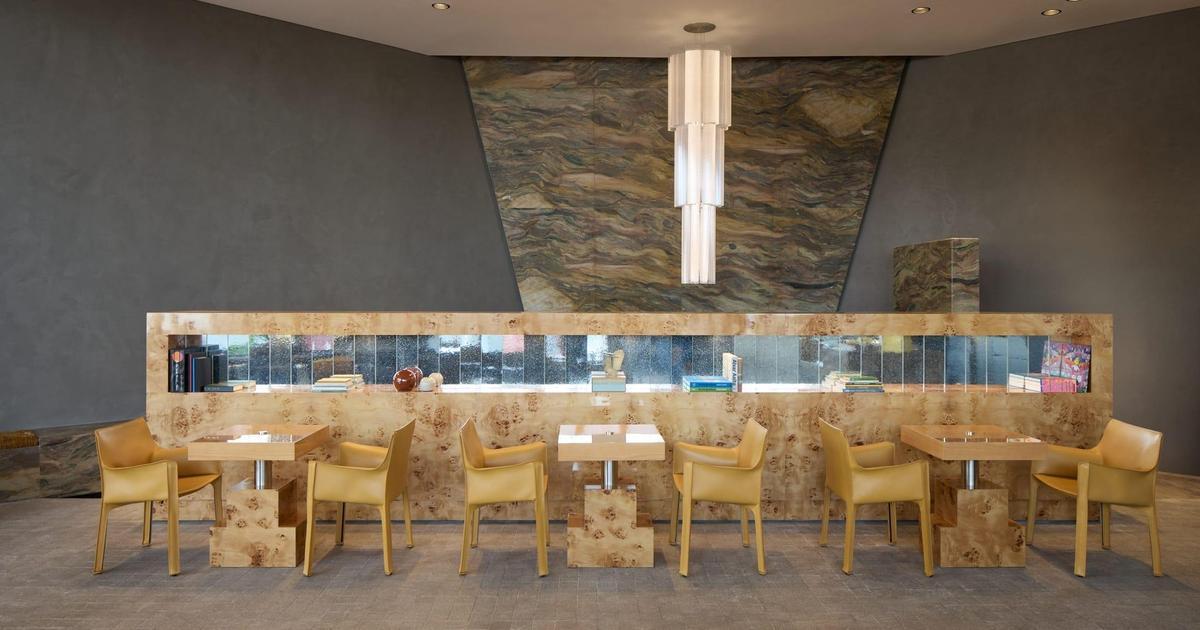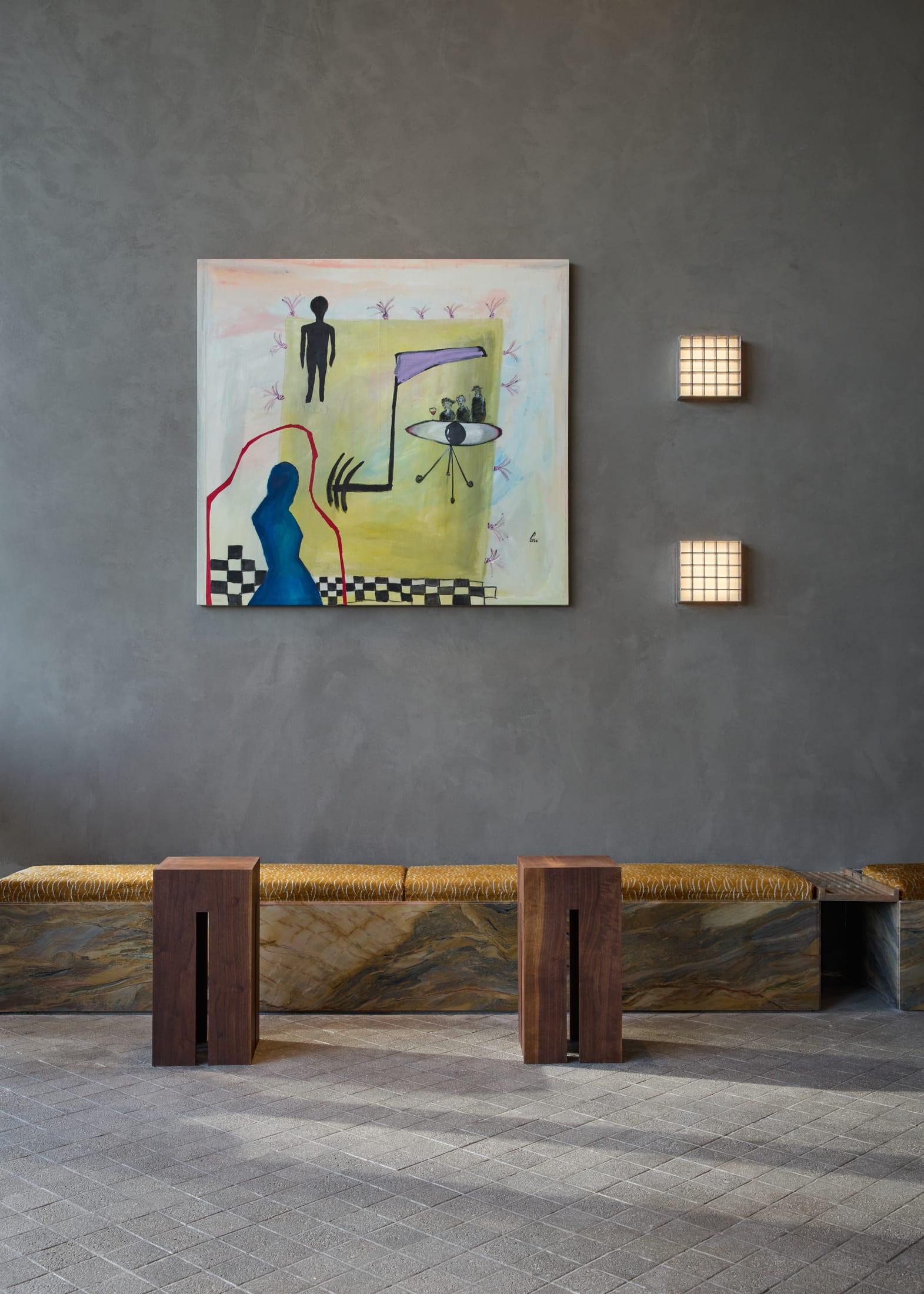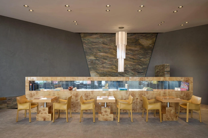 В основе архитектурного решения Daily Press — геометрическая сетка. Она проходит через весь интерьер — от потолка с металлическими кессонами до пола, выложенного плиткой под камень, и задней стены, отделанной плиткой зеллидж ручной работы. Эта строгая структура связывает внешнее и внутреннее пространство и создает каркас для визуальных эффектов.