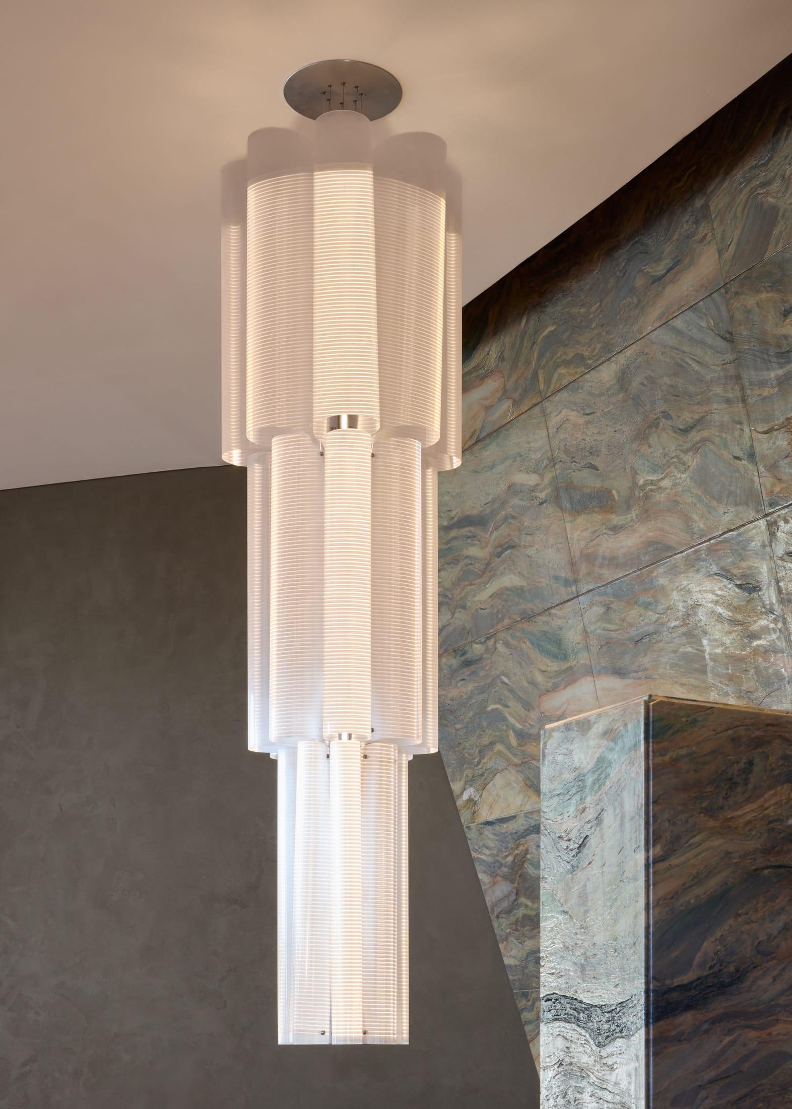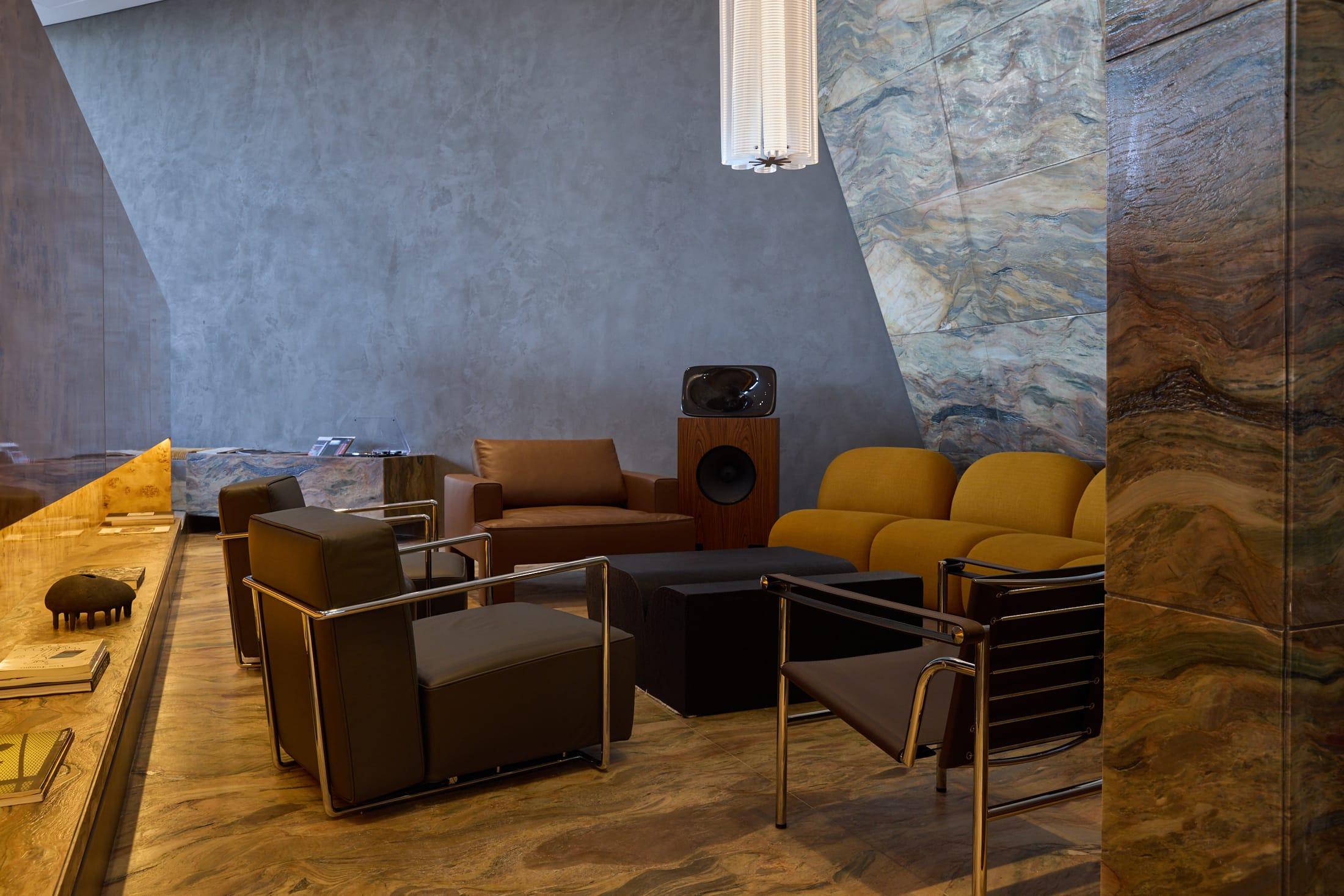 Мебель выбрали известную. В зале стоят стулья Standard Chair и Fauteuil Direction Жана Пруве (Jean Prouvé), работы Ле Корбюзье (Le Corbusier), кресло Cab 413 Марио Беллини (Mario Bellini), а также вещи марок Tacchini и Flexform. Свет — бра Bruce от Volker Haug и Flack Studio, люстры Bloom и Mazha китайского дизайнера Марио Цая (Mario Tsai).