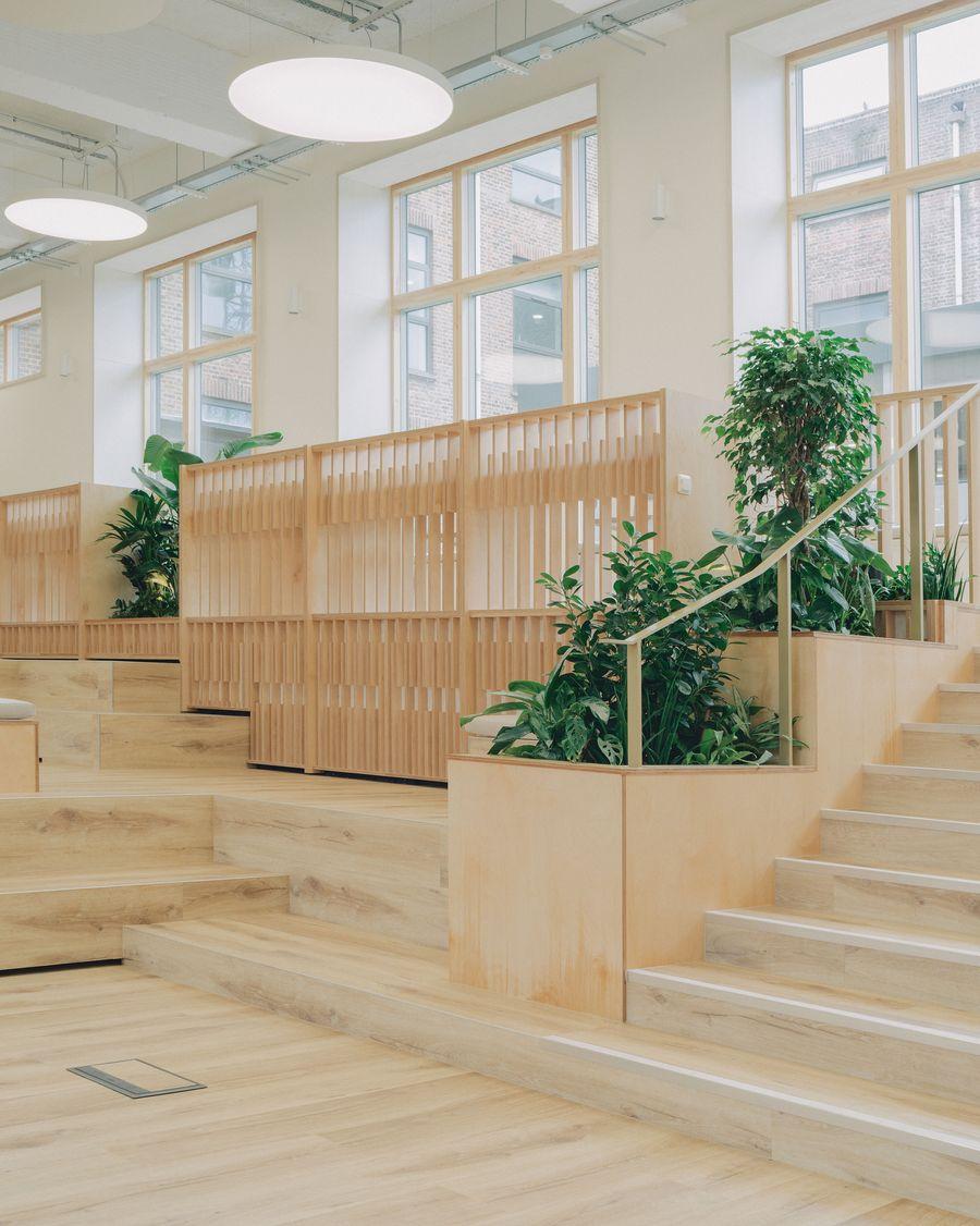 Повсеместное использование натуральных материалов (например, FSC-сертифицированной древесины) и встроенных кашпо с живыми растениями создает тактильно богатую, спокойную и «дышащую» атмосферу, способствующую концентрации.