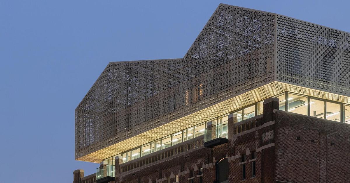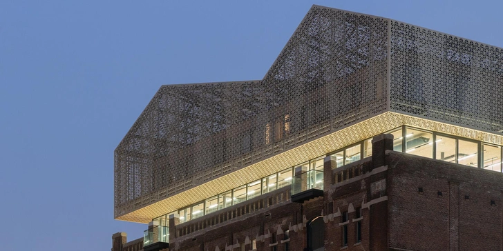 Архитекторы восстановили шесть исторических этажей и надстроили два новых. Общая высота здания теперь почти 35 метров. Верхние этажи обернуты полупрозрачным алюминиевым листом с перфорацией, который защищает от солнца. Получился контраст между тяжелым старым кирпичом и ажурной современной надстройкой.