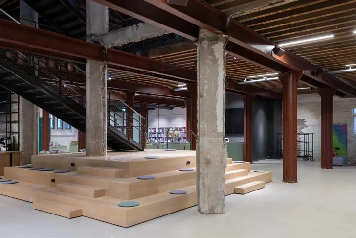 Внутри здания сделали высокий атриум — открытое пространство от подвала до крыши. Через него свет проникает внутрь и освещает чугунные колонны и деревянные балки. Всю историческую конструкцию оставили открытой, а инженерные системы аккуратно спрятали между балками.