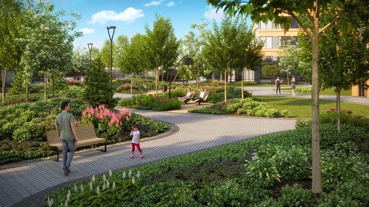 Озеленение стало приоритетом, а не декорацией. Крупномерные деревья, искусственные холмы для создания рельефа и многоуровневая высадка растений формируют ощущение природы даже в сердце мегаполиса. Функциональные зоны делятся по логике: детские и спортивные площадки, места для работы на воздухе с розетками и тихие зоны для отдыха. В «Симоновском вале» благоустройство двора проектировало бюро «Илья Мочалов и партнеры»: на искусственных холмах планируют высадить крупномерные деревья, обустроить детские и спортивные площадки.
