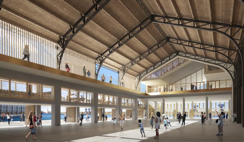 Внутри также находятся два зала с конструкциями, напоминающими об инженерной архитектуре XIX века. В северной части разместят помещения для аренды и торговые точки, а в южной создадут более открытое и функциональное пространство для проведения мероприятий. Восстановленный исторический перекрёсток и дорога, соединяющая морскую дамбу с террасами порта, расширяют набережную.