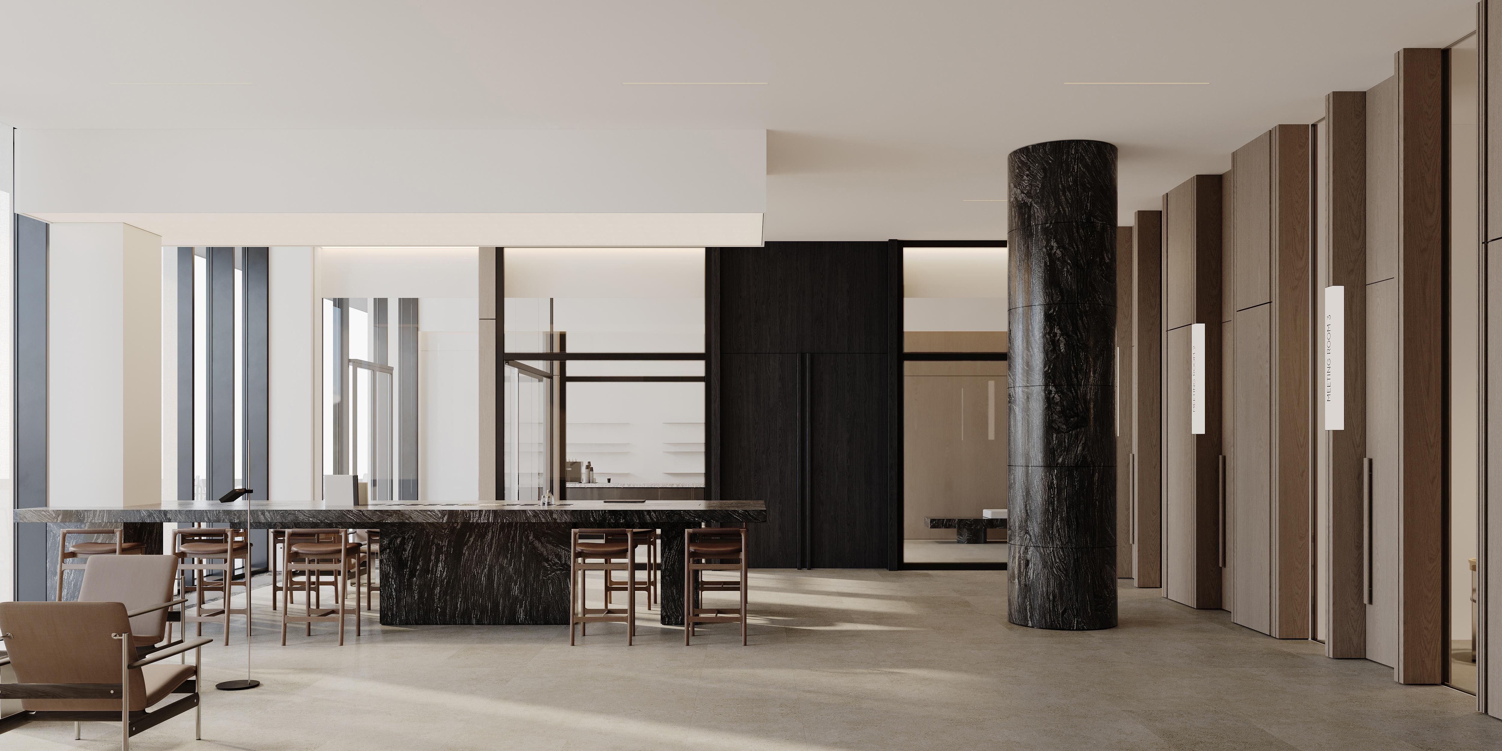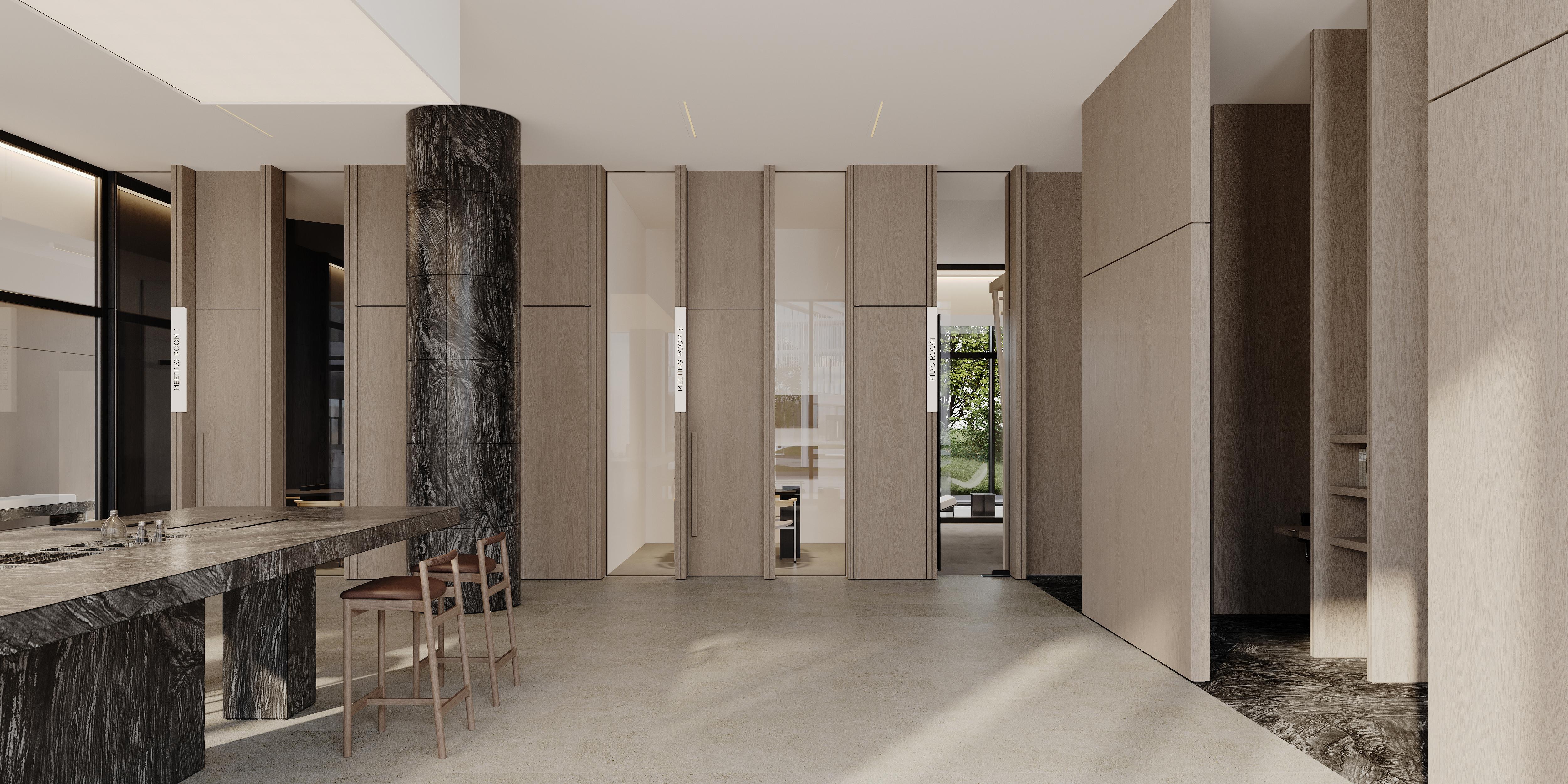 Гранд-лобби — это множество социальных сценариев, вариантов работы и досуга. Например, в знаменитом нью-йоркском кондоминиуме 53 West 53, помимо многочисленных зон для работы и отдыха, есть просторная классическая библиотека с камином. А в Grand Bayview Qianhai, расположенном в китайском Шэньчжэне, — зимние сады с пространствами для работы и занятий йогой. Российские застройщики тоже не отстают. Так, в спроектированном архитектурным бюро Ecus гранд-лобби для жилого комплекса бизнес+ класса Stone Grain предусмотрены коворкинг для фрилансеров, бизнесменов, а также персональные ячейки для индивидуальной работы, где можно трудиться, не отвлекаясь. Три переговорные для небольших встреч и совещаний и детская комната с безопасной мягкой зоной, где удобно оставить малышей, присматривая за ними сквозь стеклянные перегородки бизнес-гостиной или из галереи.