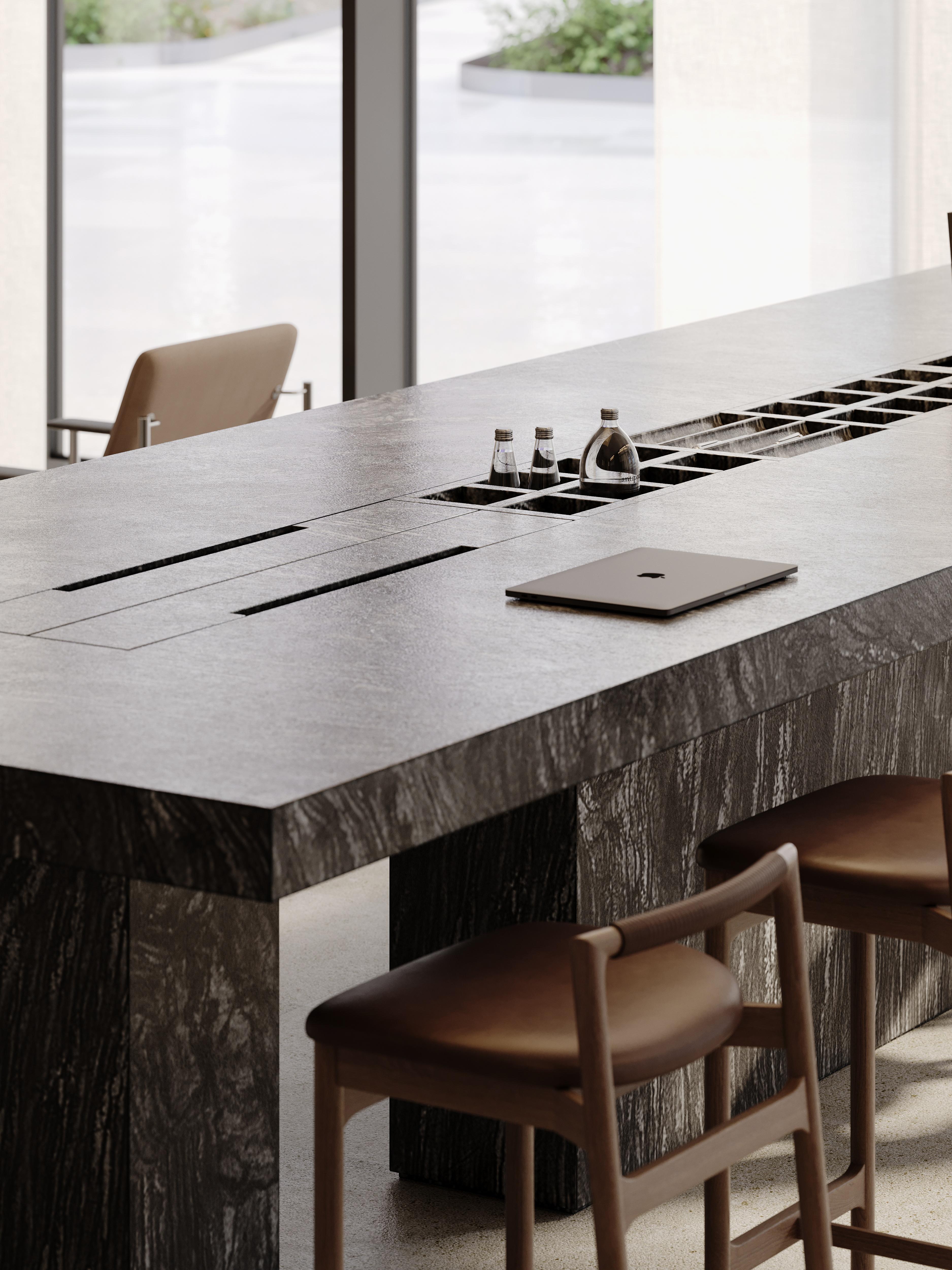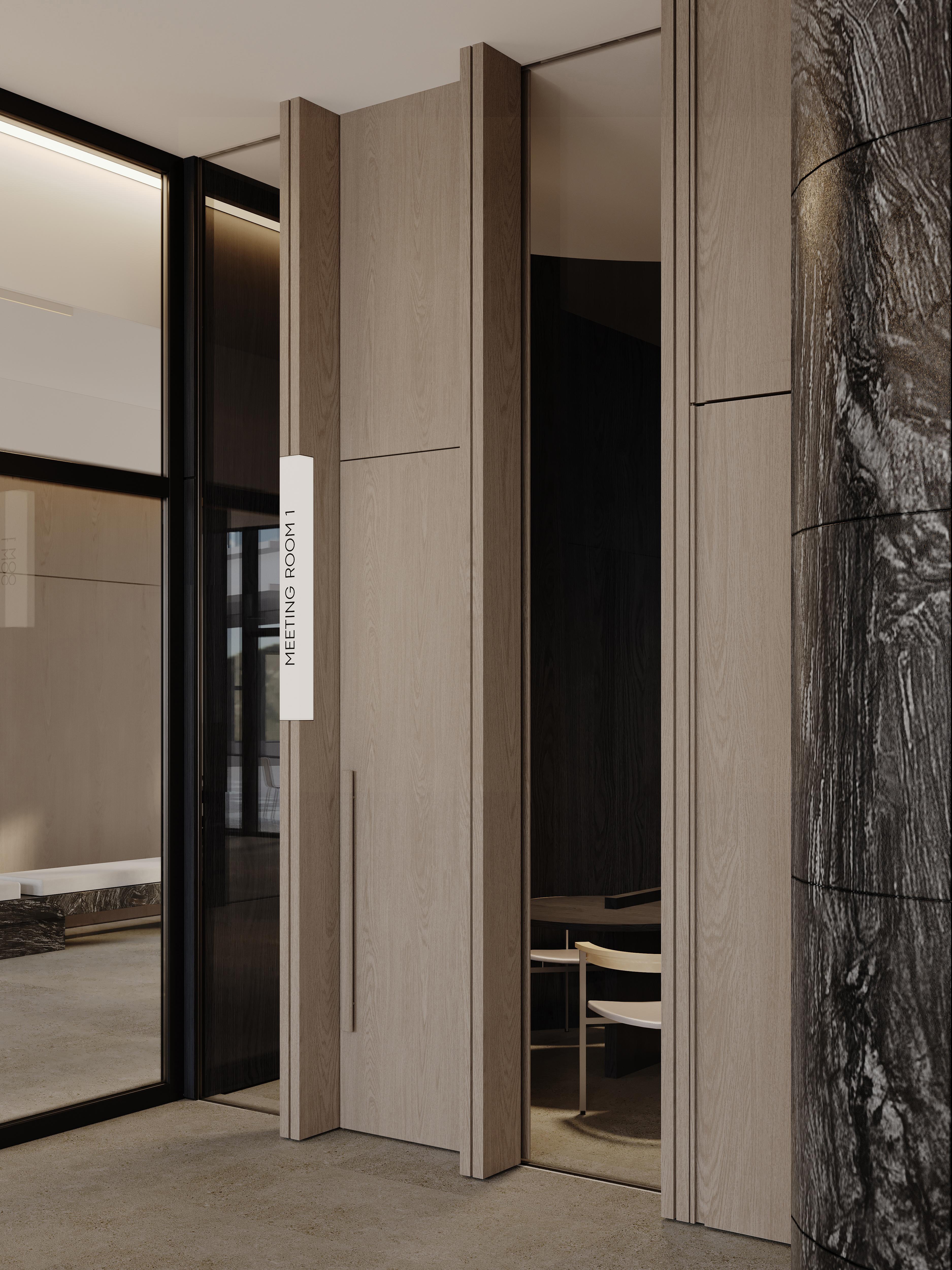 В гранд-лобби Stone Grain это выражено, например, в большом столе для коворкинга со встроенными зарядными модулями, интегрированных лайтбоксах с навигацией в дверных наличниках, рифмующихся с общей графикой пространства, и миниатюрных бра с направленным светом для камерной работы в зоне бизнес-гостиной.