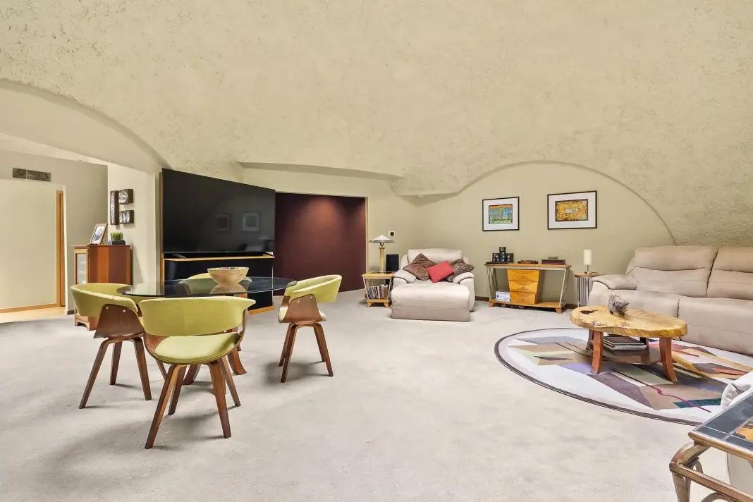 Цокольный этаж, куда ведет вход, расположенный между землей и куполами, создает ощущение надежного убежища. Здесь разместились гараж, прачечная и комната для развлечений.