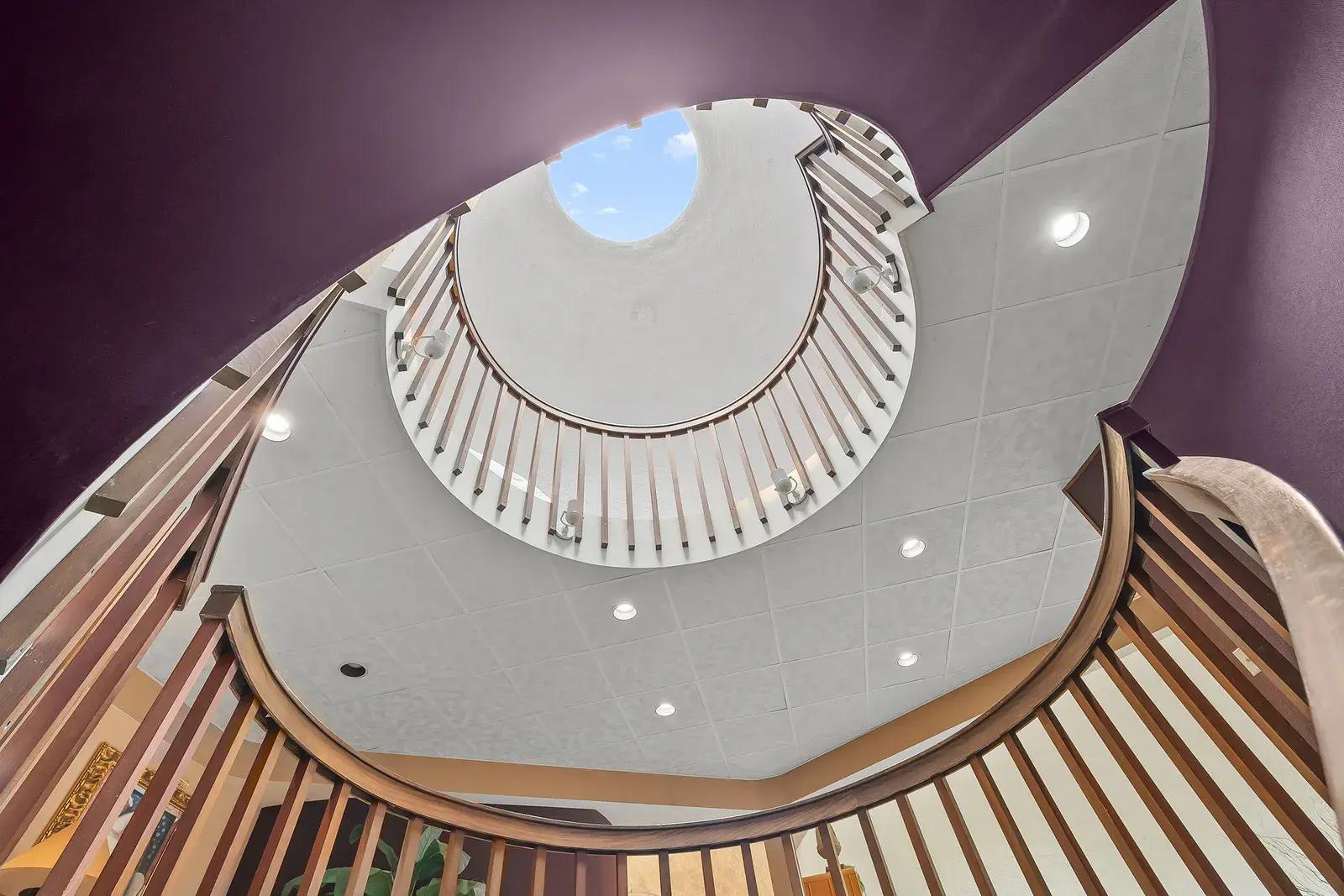 Центральная лестница, выполняющая роль светового колодца, наполняет интерьер естественным светом и ведет в основные жилые пространства: просторную кухню, две гостиные, главную спальню и несколько ванных комнат. Еще одна спальня устроена непосредственно под одним из верхних куполов.