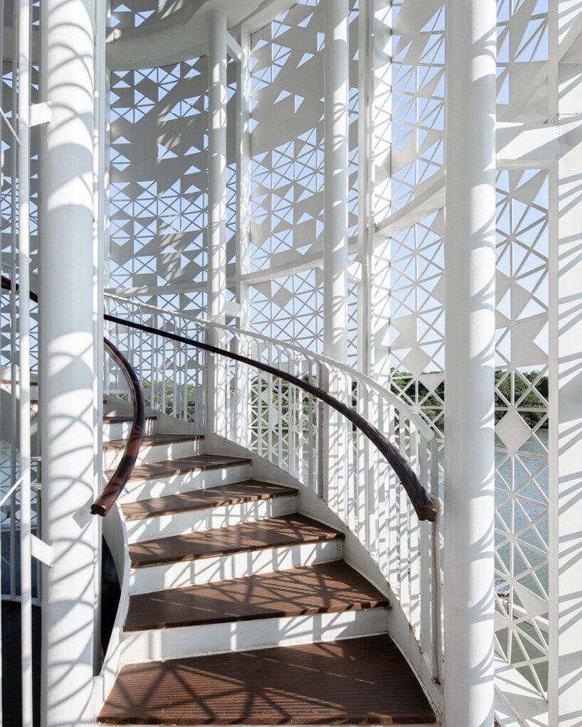 По спиральной лестнице посетители поднимаются к трем обзорным площадкам на высоте 12, 24 и 27 метров. Каждый пролет открывает новые ракурсы на мангровые заросли и залив, а каждая площадка отмечает изменение температуры, света и звука — градиент ощущений, определяемый высотой, а не замкнутым пространством.