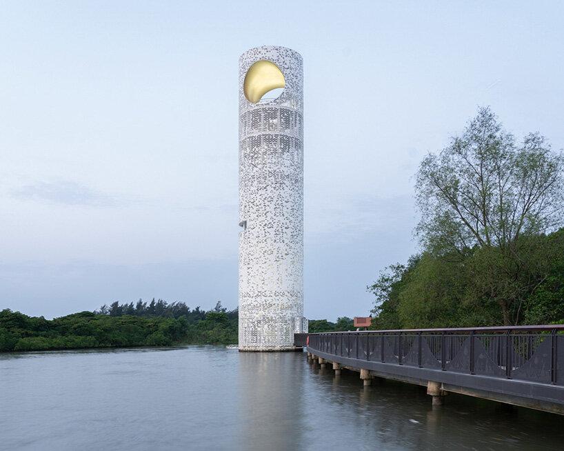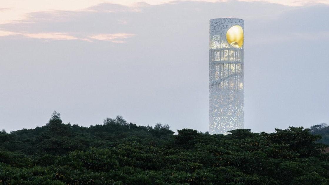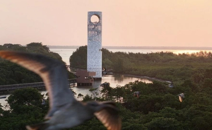 Возвышаясь на 33,5 метра среди мангровых зарослей, башня своим стройным силуэтом перекликается с вертикалями окружающих деревьев. Ее цилиндрическая форма выбрана не случайно: это минимальное вмешательство в хрупкую экосистему заповедника, где находится крупнейший в Китае массив мангровых лесов.
