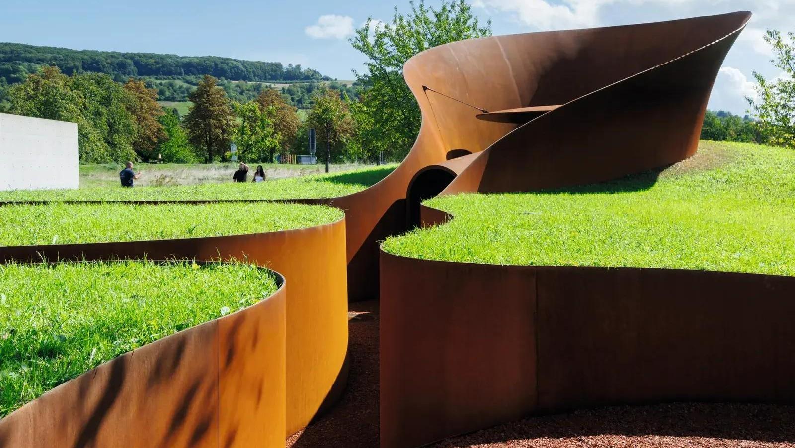 Для строительства выбрали необычный материал — переработанная сталь XCarb, которую предоставила компания ArcelorMittal. Со временем поверхность этой стали меняет цвет и фактуру, что делает павильон «живым», постоянно изменяющимся объектом. С наступлением вечера включается подсветка, встроенная прямо в землю вдоль стен. Создается впечатление, будто свет исходит из-под земли, мягко освещая весь павильон.