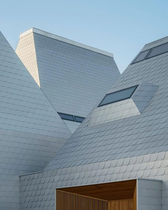 Посетители попадают в музей на верхнем уровне, а затем спускаются по склону вниз — этот прием архитекторы уже использовали в других своих работах. Входная зона сделана почти по-домашнему: открытые стойки, небольшое кафе, уютная атмосфера.