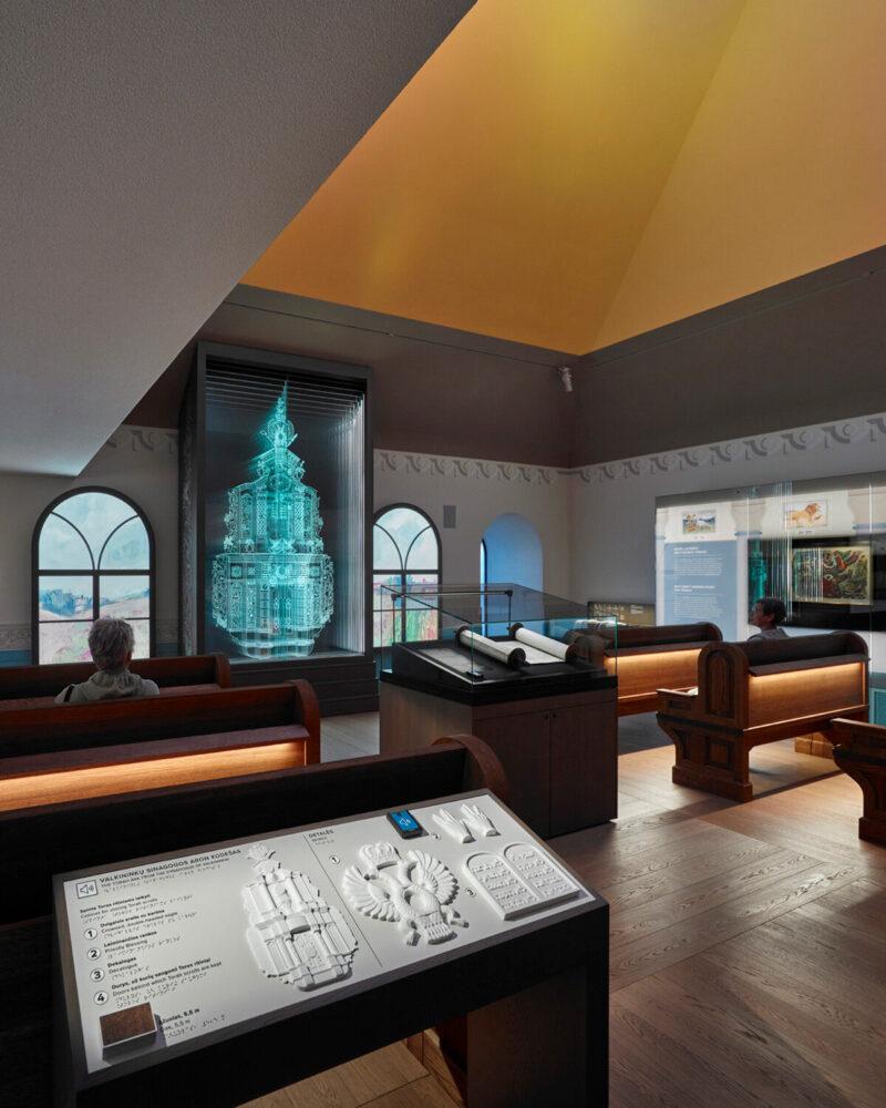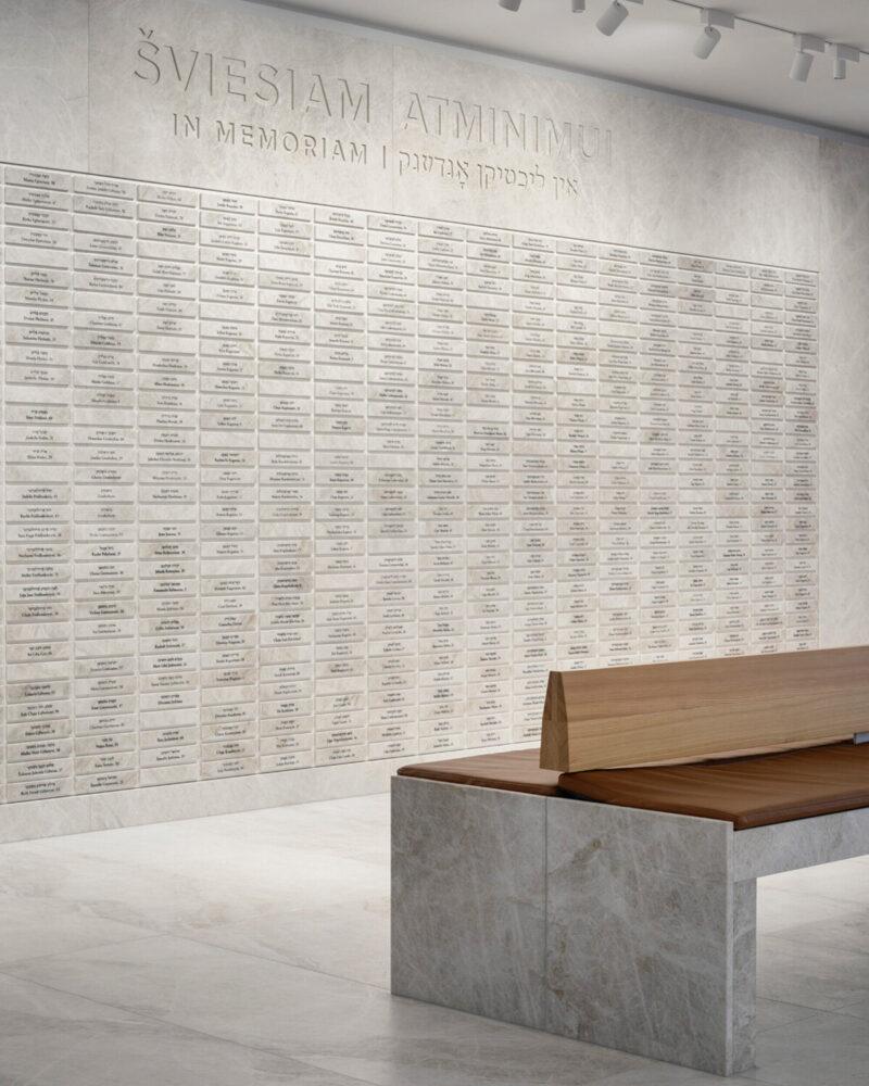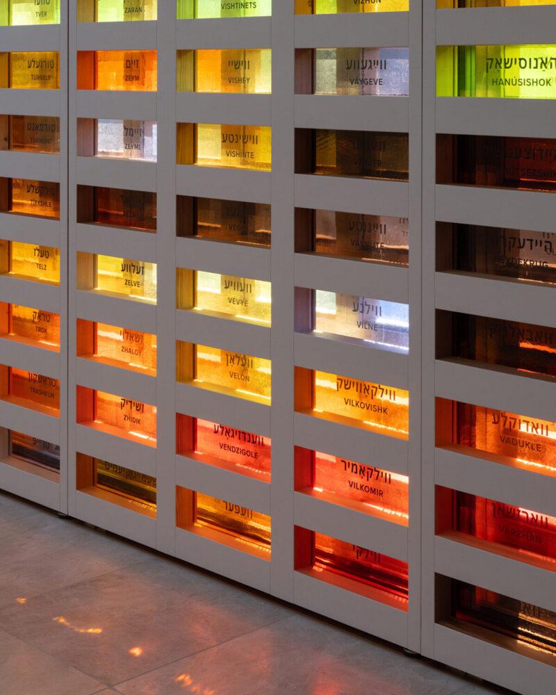 Особое место занимает стена с названиями всех 294 еврейских общин, которые когда-то существовали на территории Литвы. Они выгравированы на пластинах из выдувного стекла, вставленных в деревянную решетку. Свет проходит сквозь стекло, оживляя поверхность и добавляя глубины буквам.