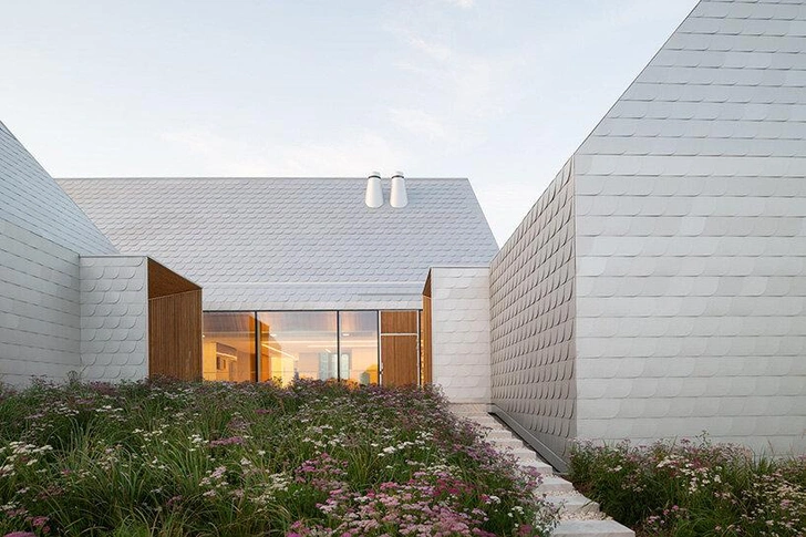 Фасады обшиты морским алюминием. Материал выбрали за долговечность и возможность переработки. Листы нарезаны и уложены так, что напоминают деревянную черепицу — отсылка к старым сараям и амбарам, которые до сих пор встречаются в литовских полях. В пасмурную погоду металл выглядит матовым, на солнце начинает мягко мерцать.