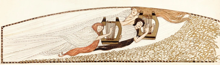 Эскиз декоративного панно с женскими фигурами, играющими на лирах, для оформления Малого фойе Московского Купеческого собрания на Малой Дмитровке. 1907–1909 гг. Из собрания Музея архитектуры им. А. В. Щусева.