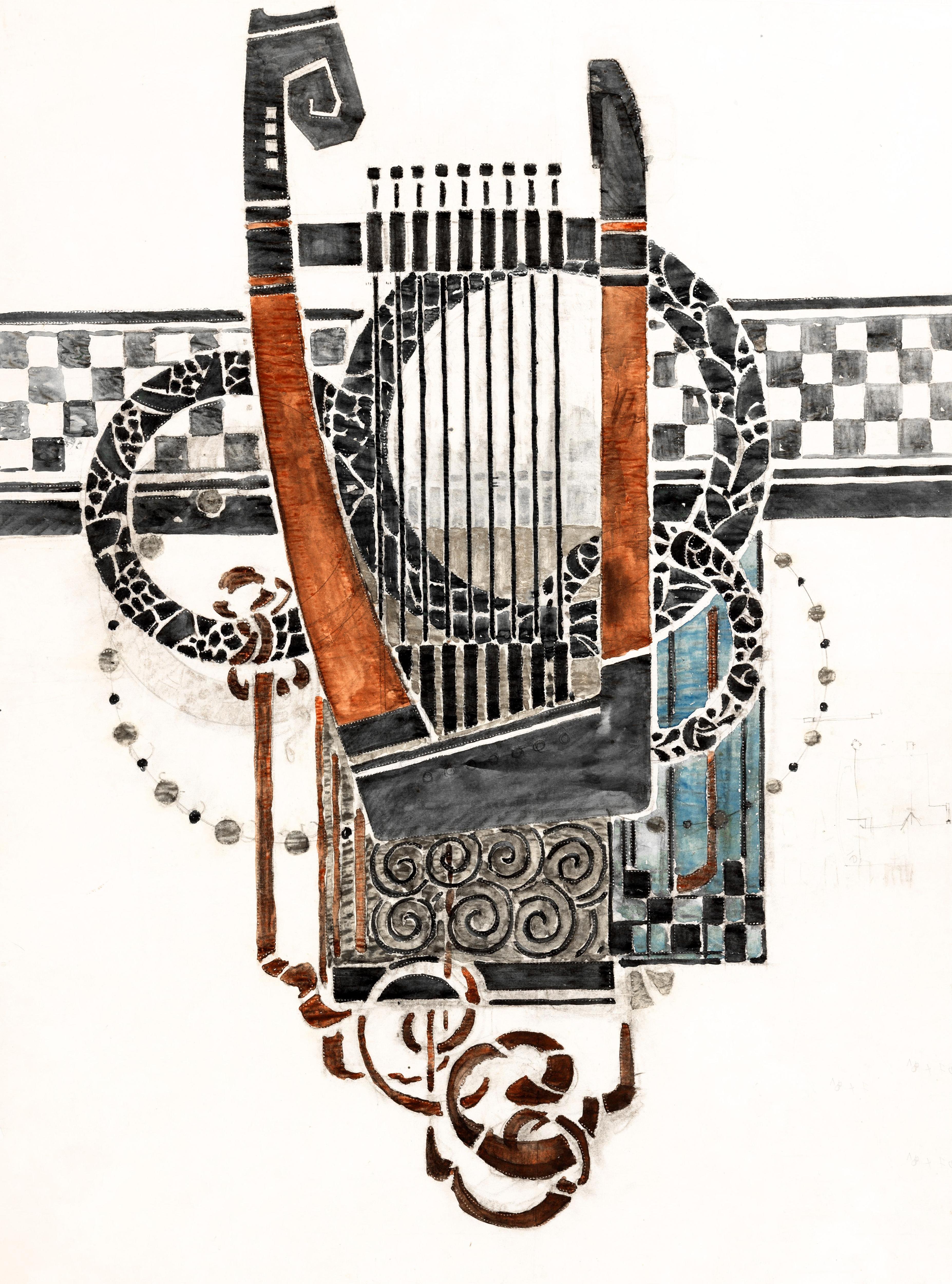 Эскиз декоративной композиции с лирой и венками для росписи стен Московского Купеческого собрания на Малой Дмитровке. 1907–1909 гг. Из собрания Музея архитектуры им. А. В. Щусева.