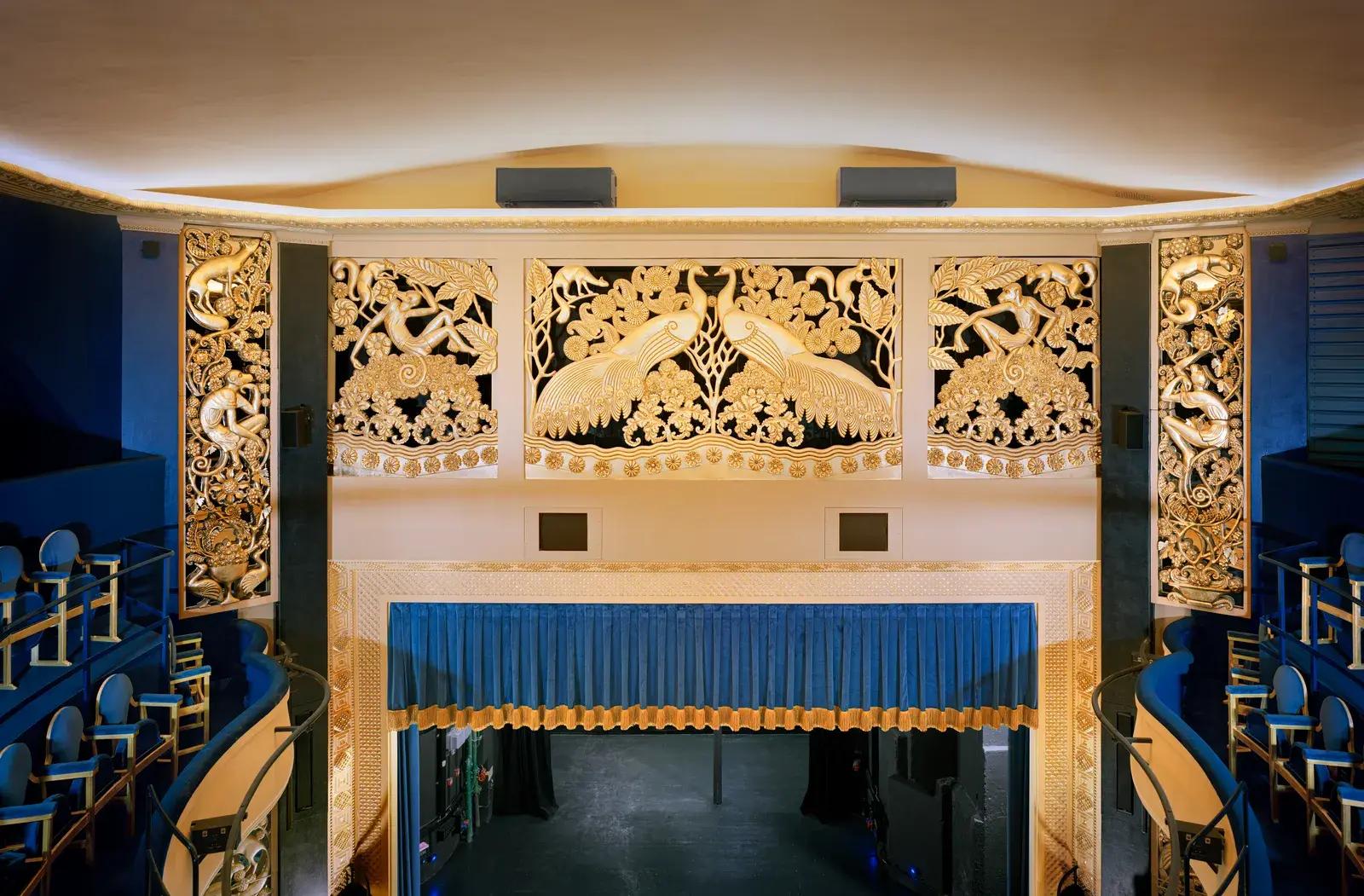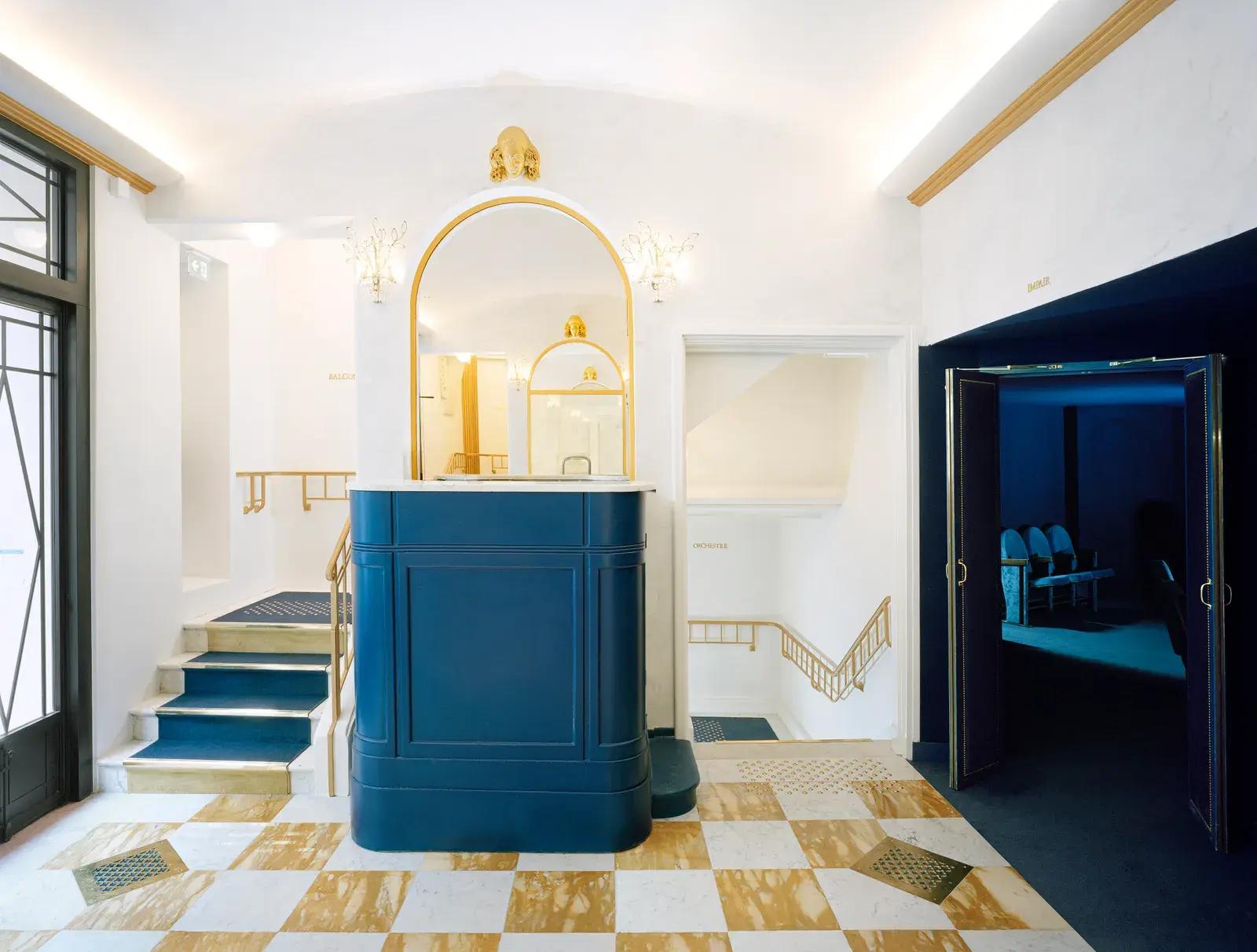 Вместо традиционного красного бархата использовали фирменный синий цвет кутюрье — «bleu Lanvin», а стены украсили золотыми маргаритками — любимым цветком Ланвен, в честь которого она назвала свою дочь. Обрамление сцены украсили резными фигурками животных: павлинами, обезьянками и белками. Это было очень смело и современно для своего времени.