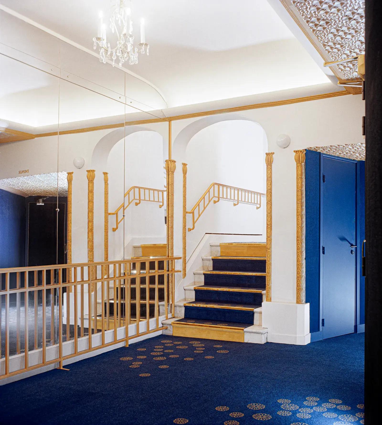 Чтобы поддержать мотив золотых маргариток, для пола придумали специальную ковровую дорожку с таким же узором. Старинные люстры в виде цветочных гирлянд почистили и отреставрировали специалисты Mathieu Lustrerie, а Клементина Месси создала новые драпировки для стен и сценический занавес.