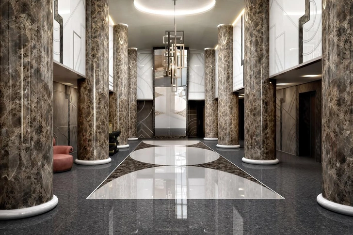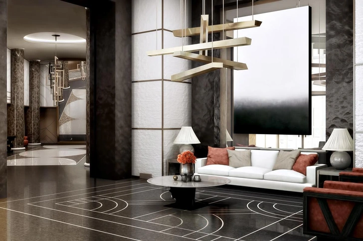 Интерьеры выдержаны в стиле сдержанной роскоши: натуральный камень, редкие породы дерева, текстурные ткани, сложное освещение. Здесь нет демонстративной вычурности, создана атмосфера тишины и защищенности. Частные лифты, служебные входы, усиленная безопасность — квартира живет по законам закрытого клуба.