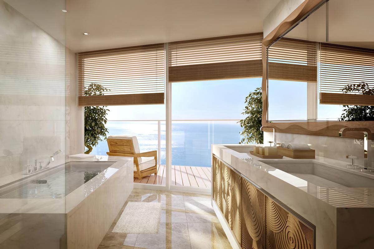 Апартаменты Sky Penthouse включают пять основных спален и три отдельных мини-квартиры для обслуживающего персонала. Пространство организовано так, что отовсюду открываются роскошные виды на на Средиземное море: из гостиных с панорамным остеклением, спален с террасами или уединенных кабинетов.