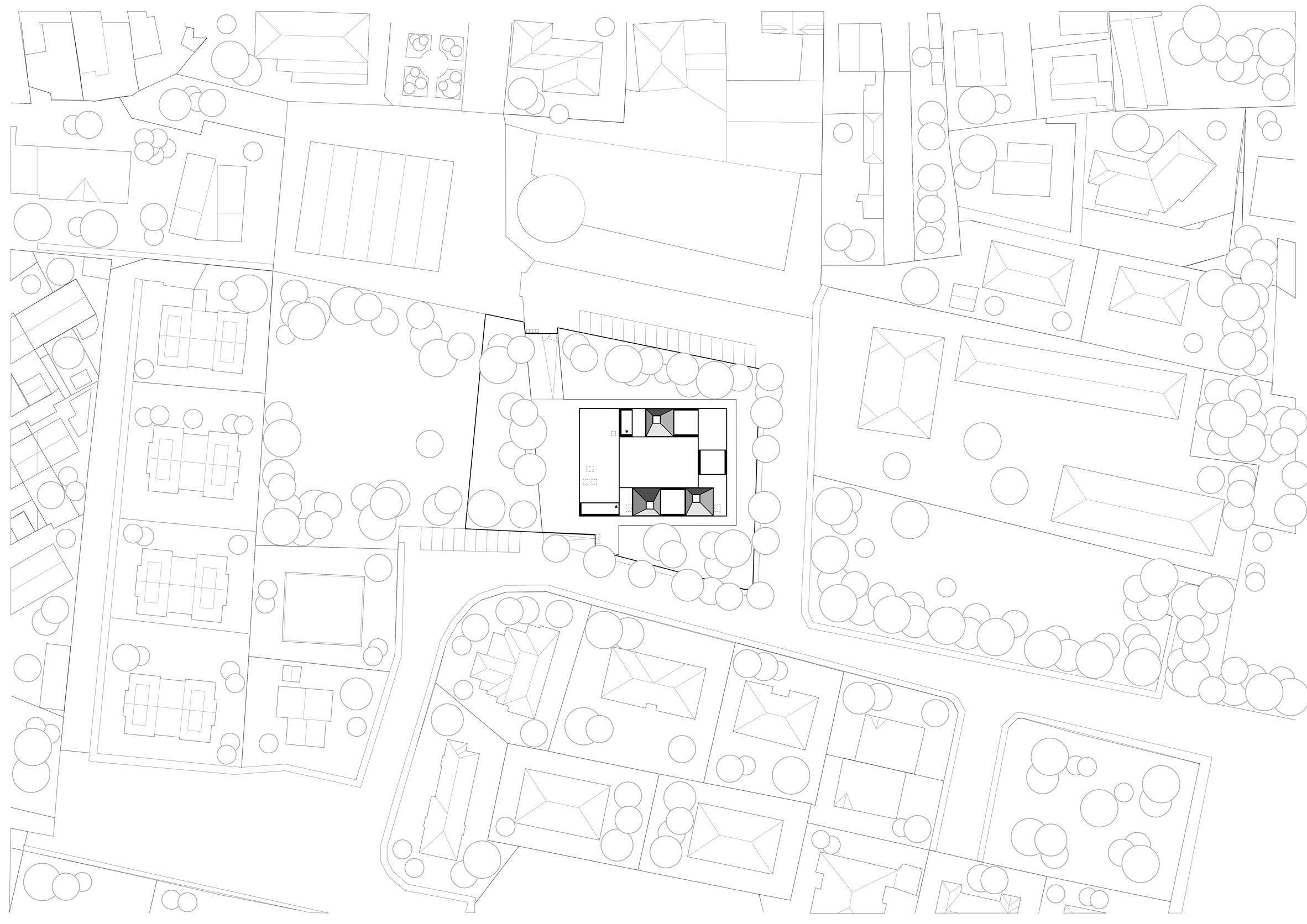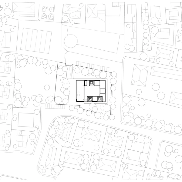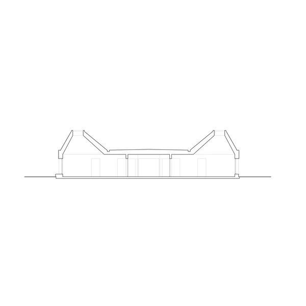 По периметру здания расположены три внутренних дворика, которые через большие проемы перетекают в зеленую зону, а мощеная дорожка и бетонные скамьи, идущие вдоль фасада, дополняют плавный переход от интерьера к ландшафту.