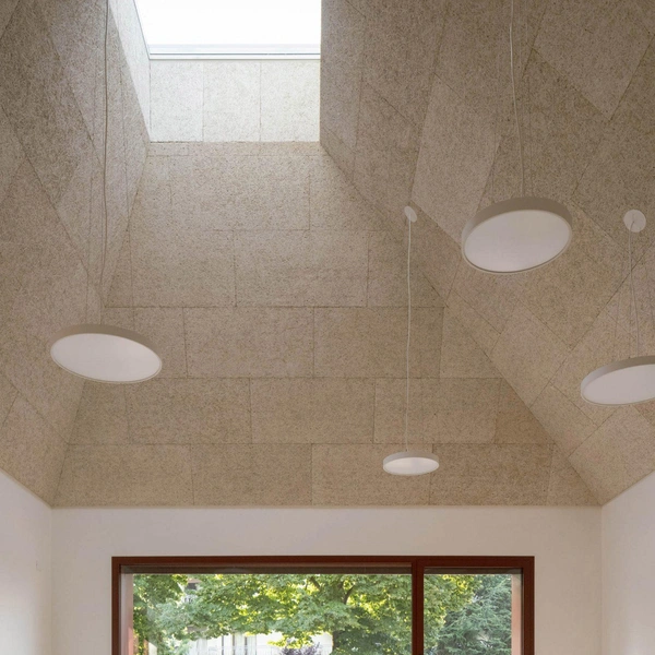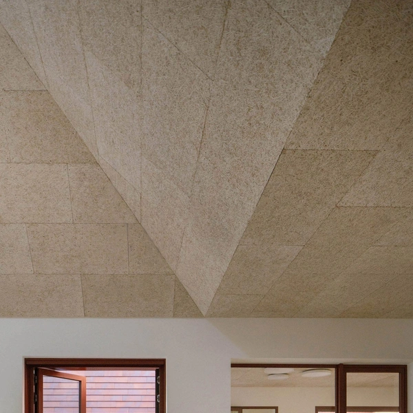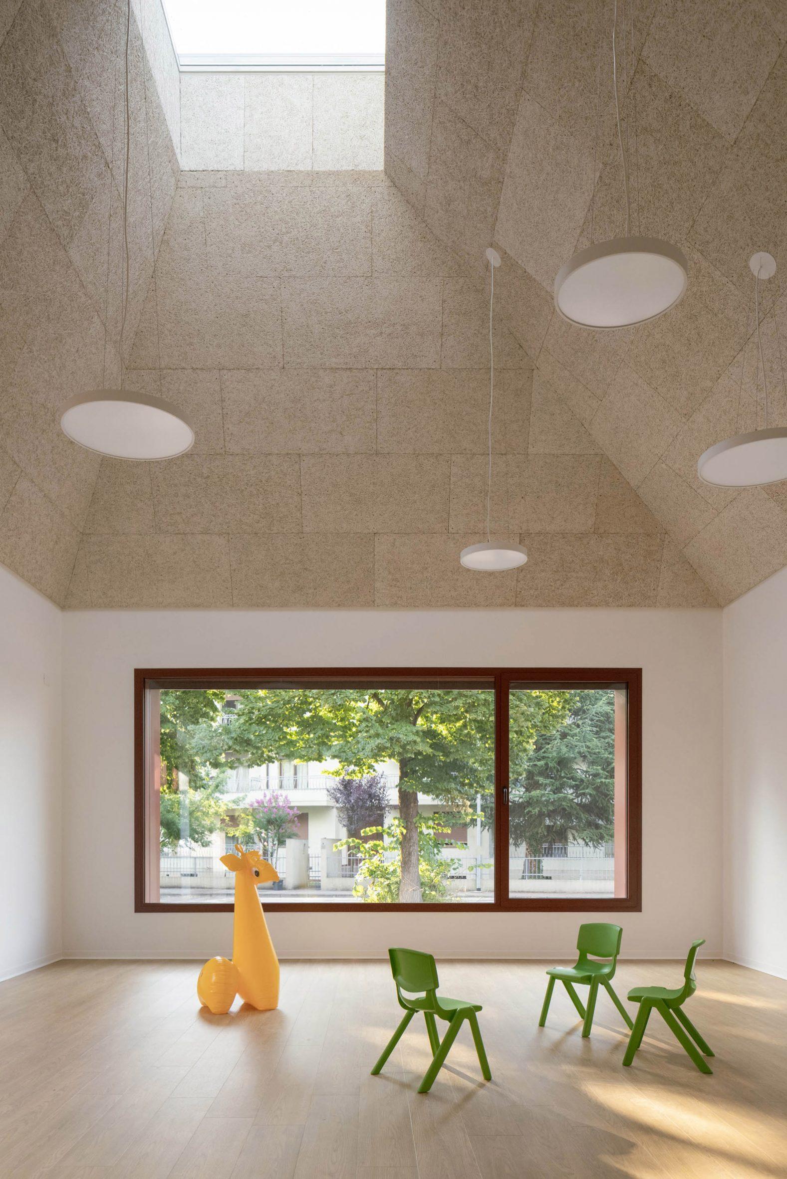 Внутреннее пространство подчинено принципам простоты и функциональности. В учебных классах высокие потолки с пирамидальными сводами заканчиваются световыми фонарями, которые, по задумке авторов, должны «зажигать воображение» детей. Минималистичная палитра — деревянные полы, белые стены, акустические панели из древесного волокна на потолке — позволяет сконцентрироваться на геометрии пространства и игре света.