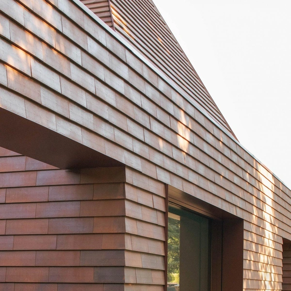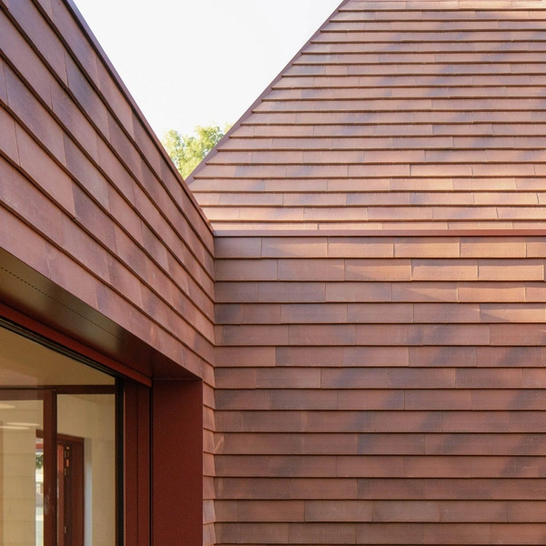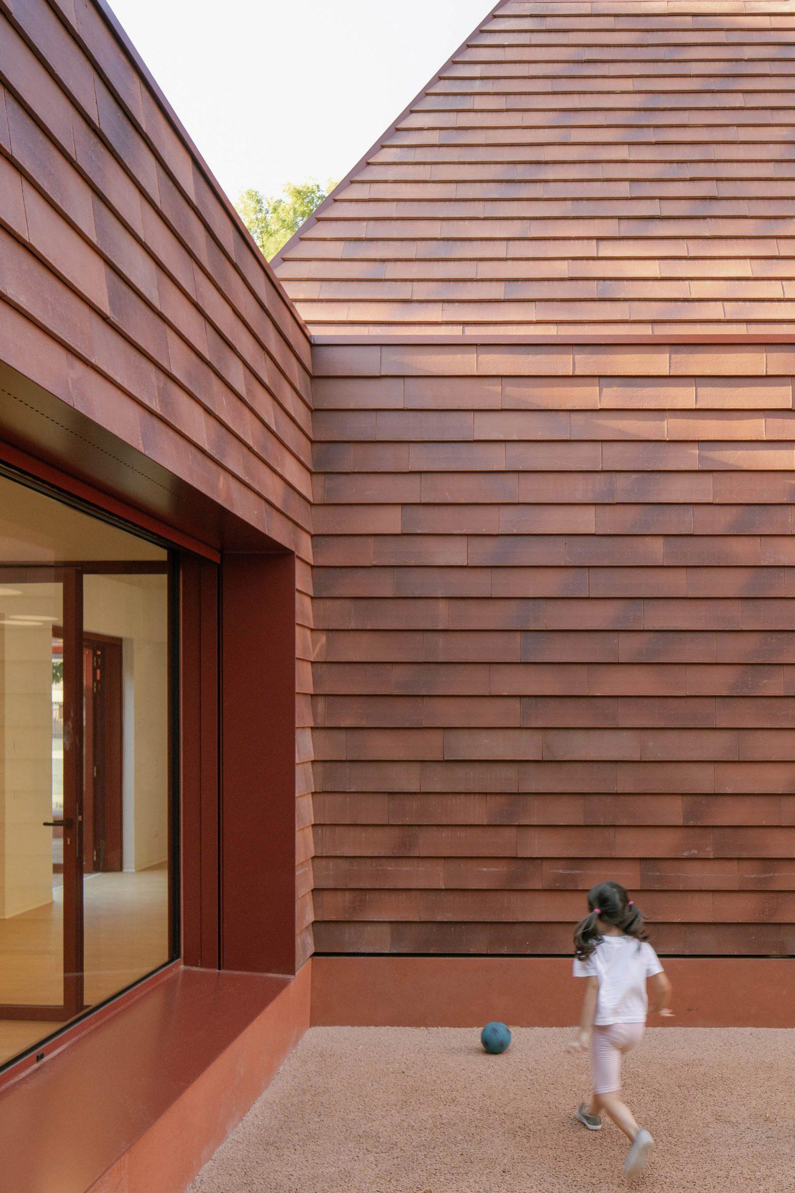 И стены, и кровля облицованы терракотовой черепицей, а бетонные элементы и оконные рамы выкрашены в близкий терракоте оттенок. Это не только эстетический ход, но и еще одна связующая нить с земляными оттенками и традиционными материалами региона.
