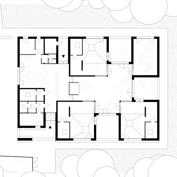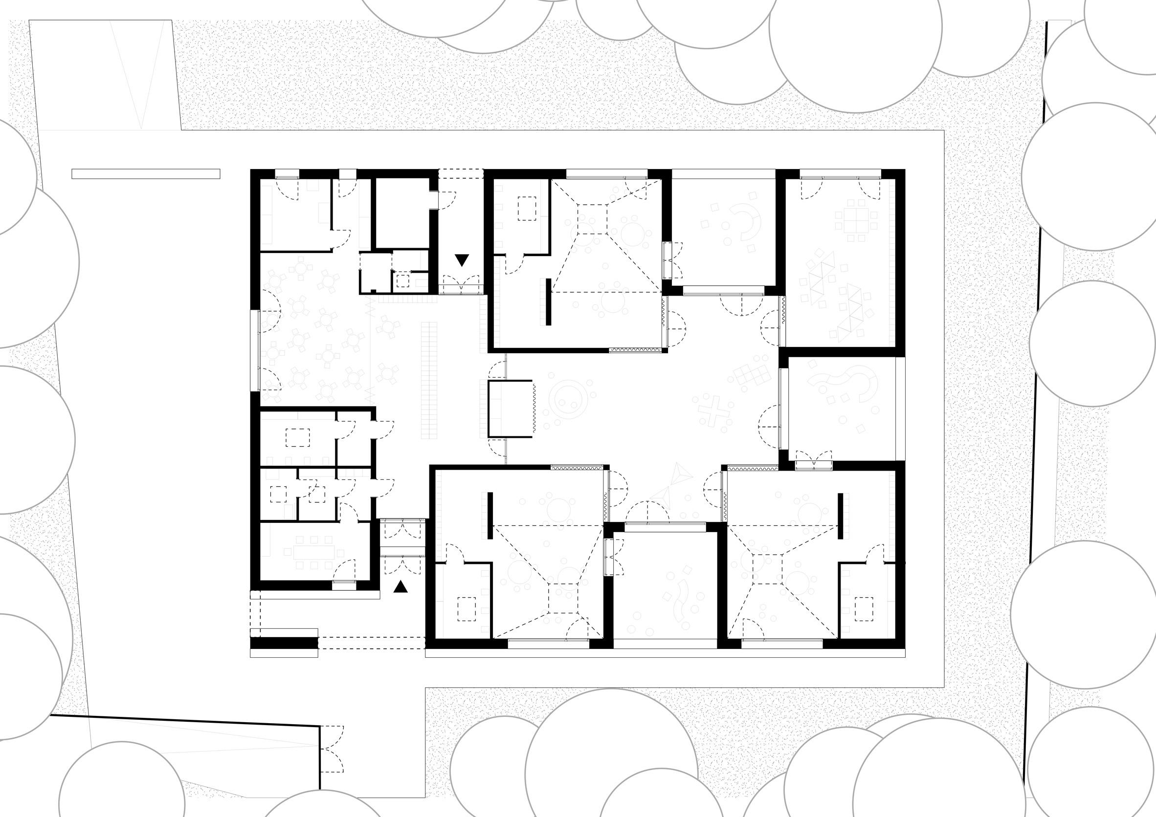 Архитекторы создали композицию из нескольких пирамидальных «домиков», сгруппированных вокруг центральной площади. Эта внутренняя площадь — многофункциональный игровой зал, куда выходят все учебные классы. Такой планировкой архитекторы отказались от традиционных коридоров, превратив все переходы в осмысленные, наполненные светом пространства для общения.