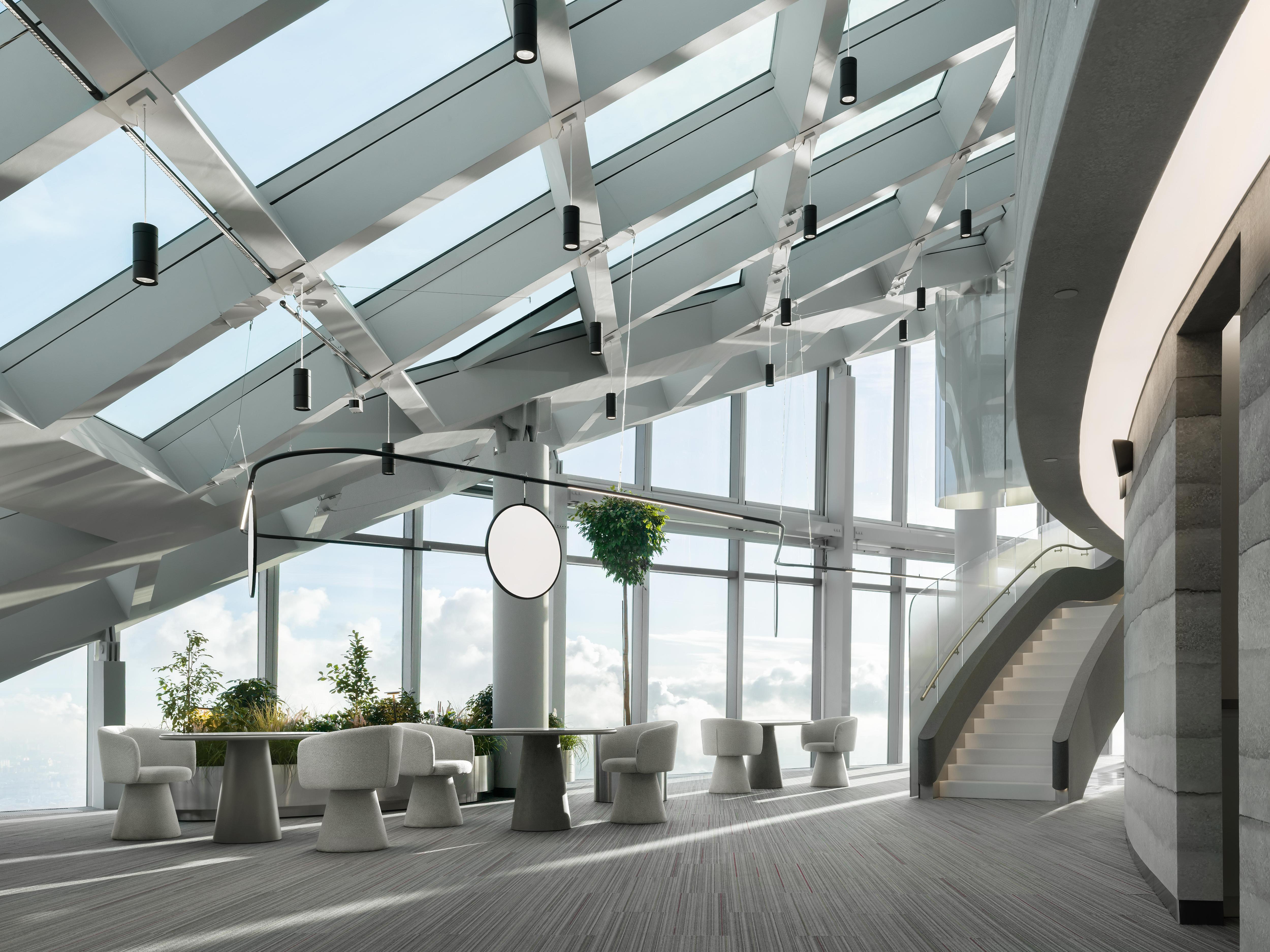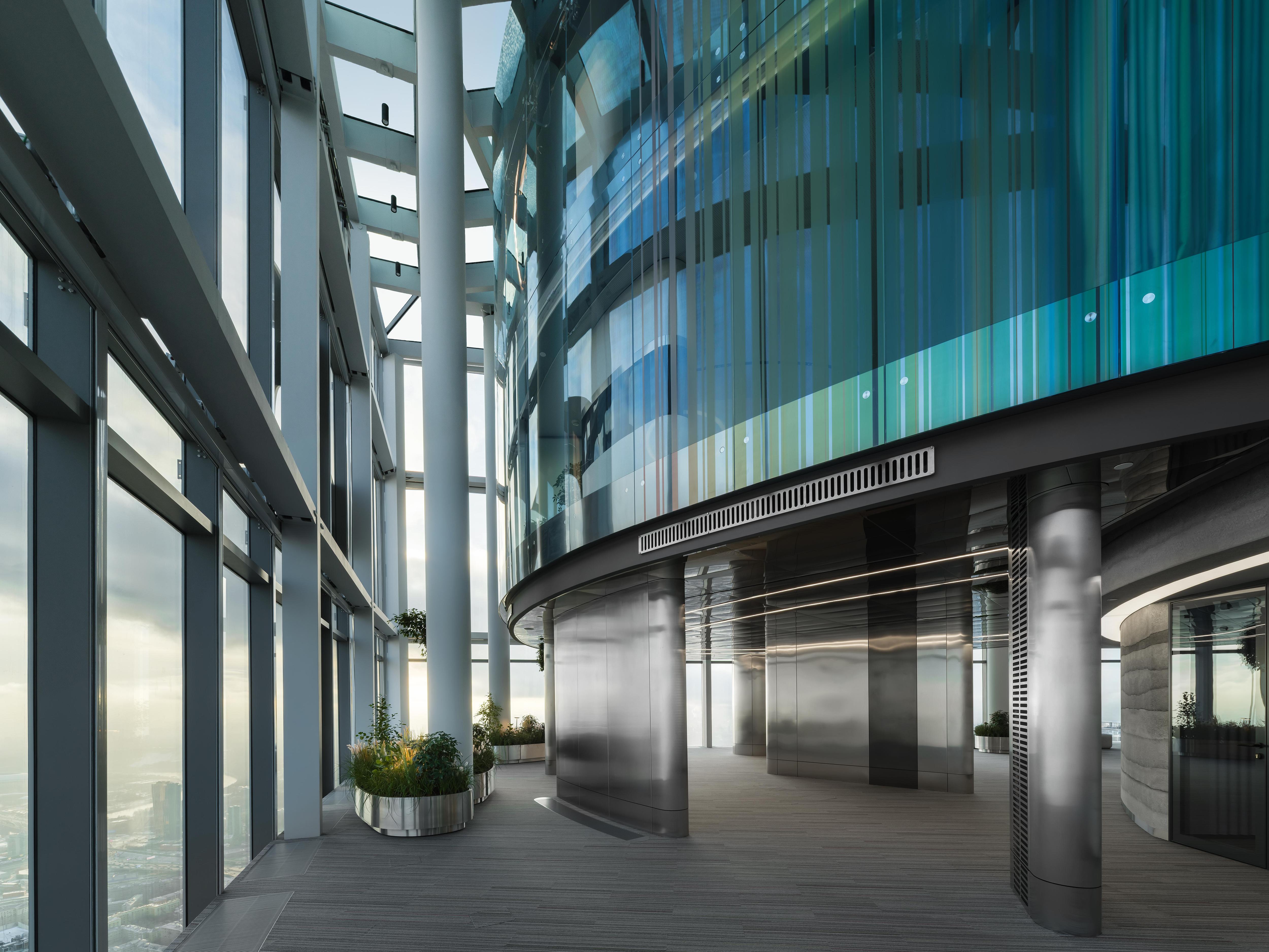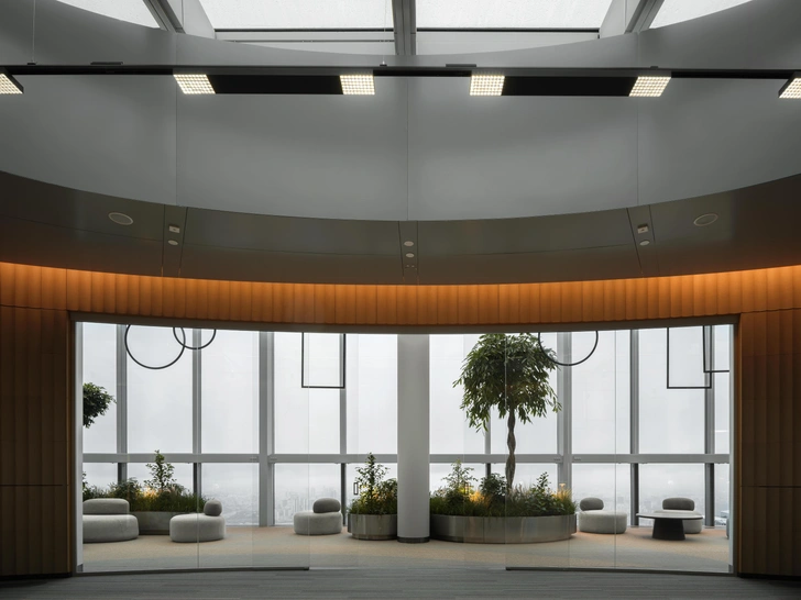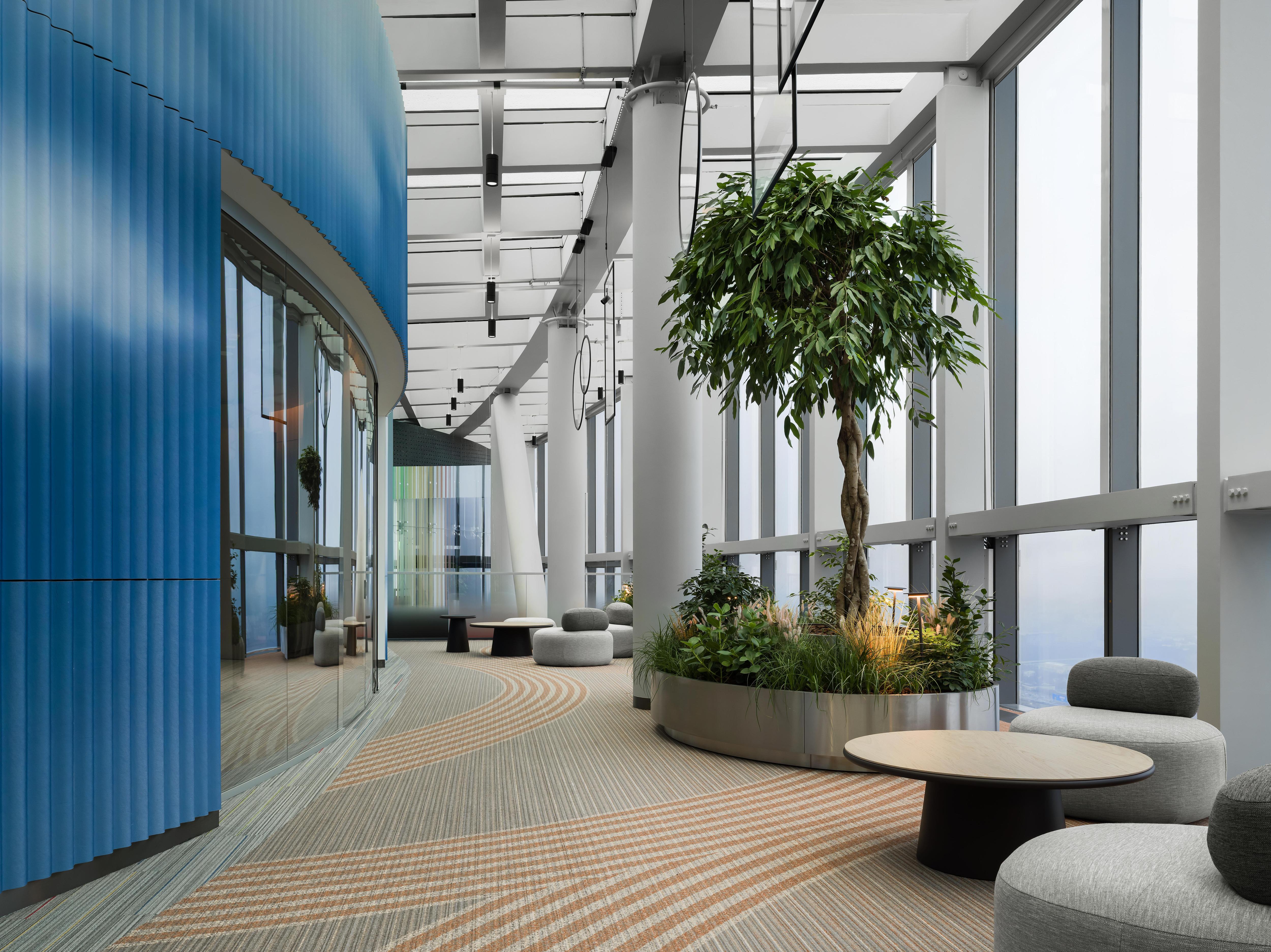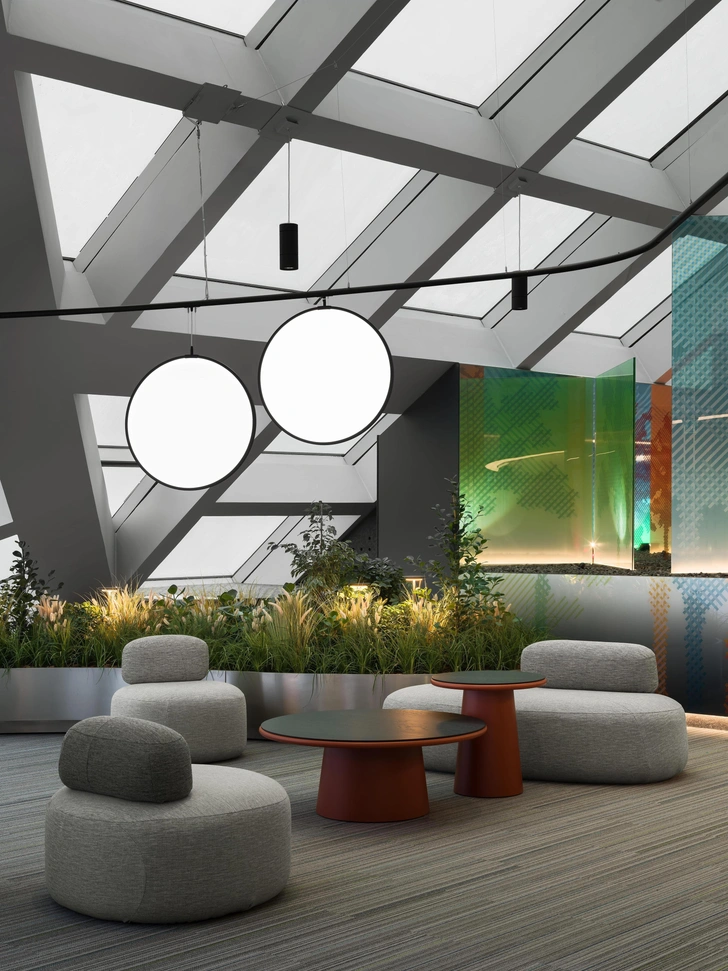 Третий уровень — выделенная резиденция с самыми высокими в Европе VVIP-кабинетами для первых лиц с панорамными остеклением, отдельным ресепшн, переговорными, конференц-залом и зеленой лаунж-зоной для отдыха. Для удобства перемещения все уровни офиса обслуживают два отдельных стеклянных лифта, а озеленение пространства живыми деревьями создает ощущение баланса современных технологий и природы.
