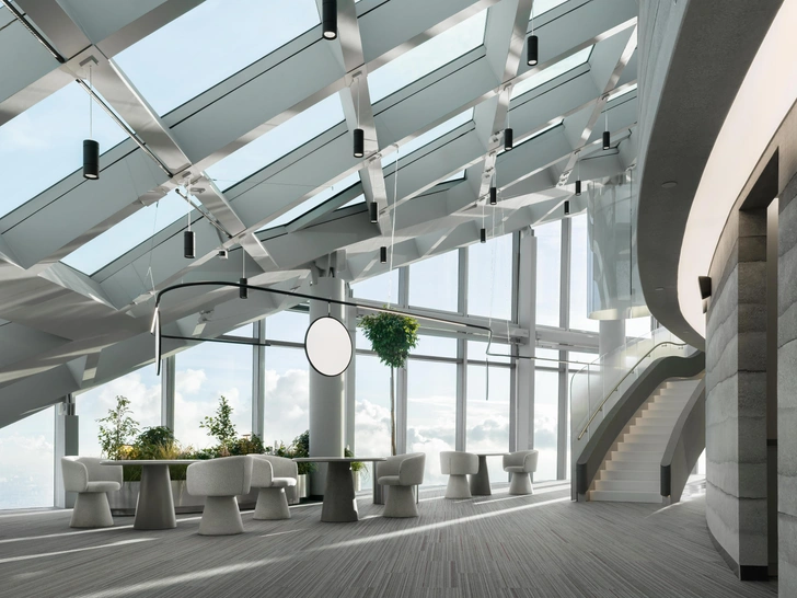 Необычное технологическое решение — высокий стеклянный купол, стирающий грань между архитектурой и небом — позволил сохранить максимальную высоту потолков и визуальную чистоту пространства: все инженерные системы полностью скрыты под фальшполом.