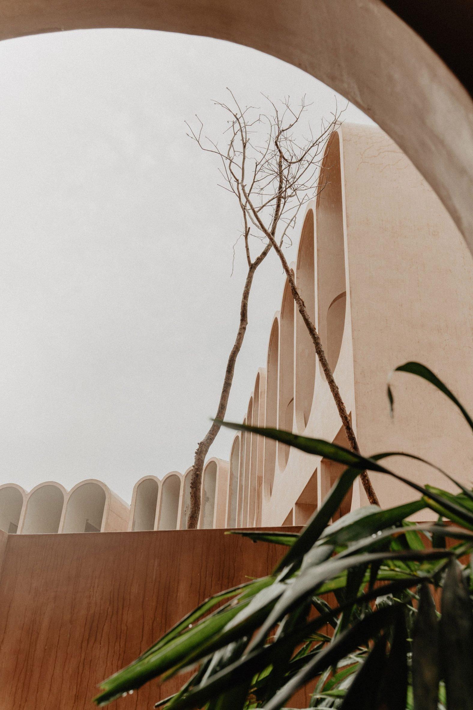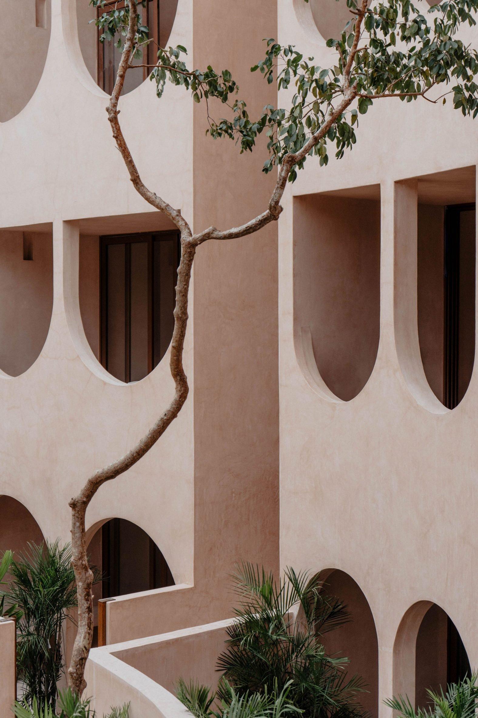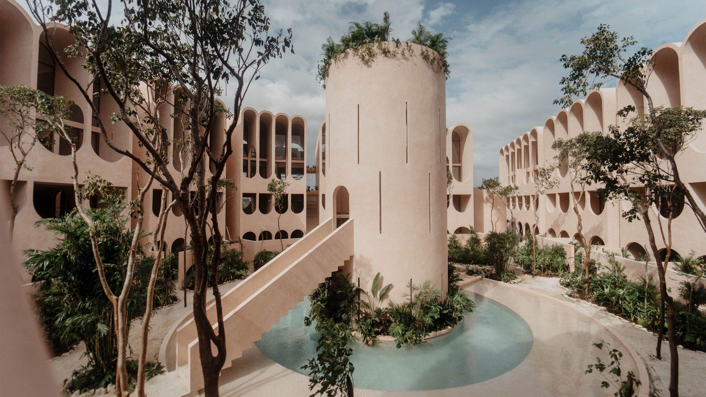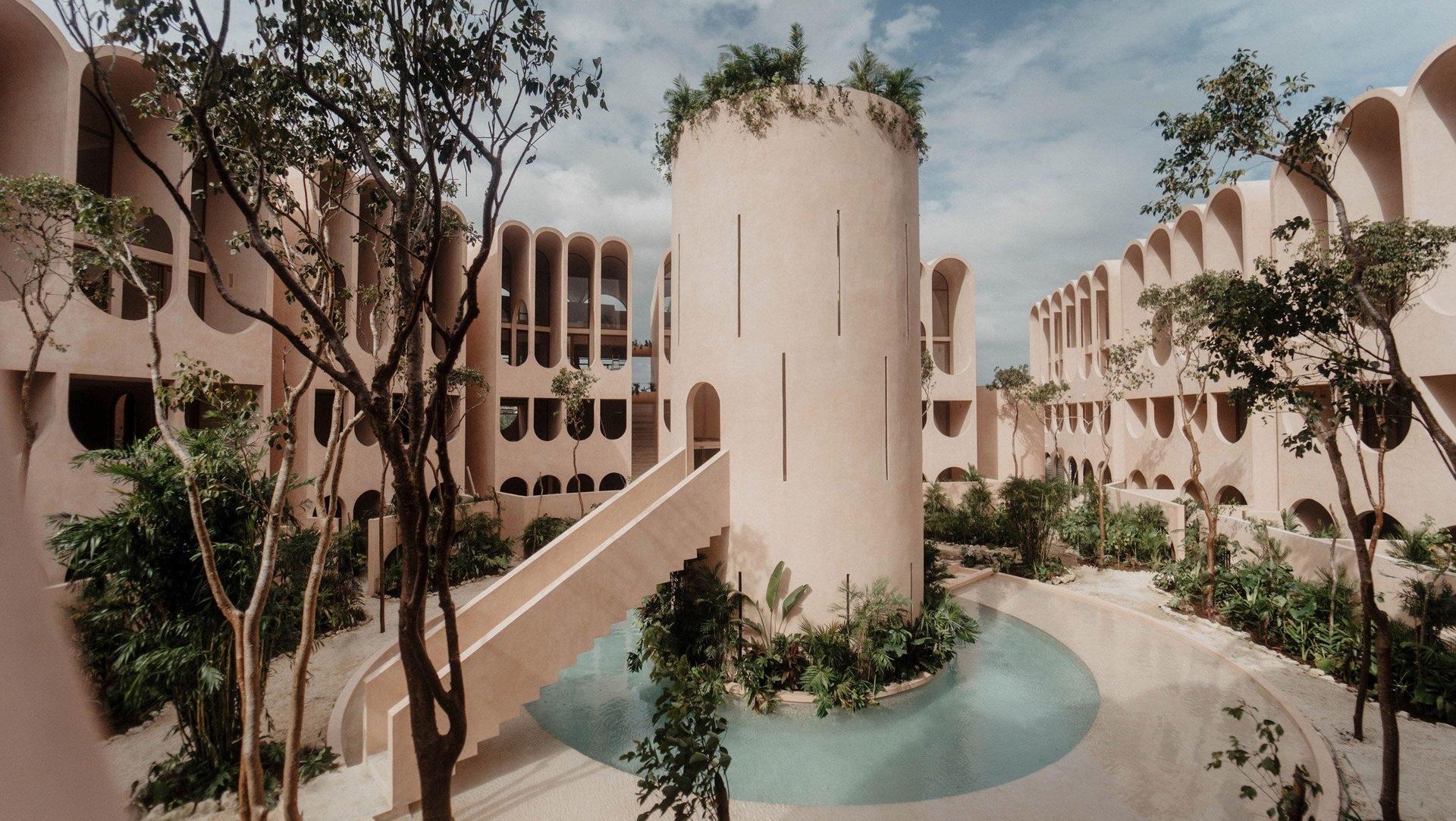 Здание облицовано известняковой штукатуркой, распространенной на полуострове Юкатан. Этот нежно-розовый материал ценится за влагоустойчивость, хорошую терморегуляцию и практичность. Отсылки к традиционным ремеслам сохраняются и в интерьерах башни с глиняными элементами и отделкой из пород тропических деревьев.